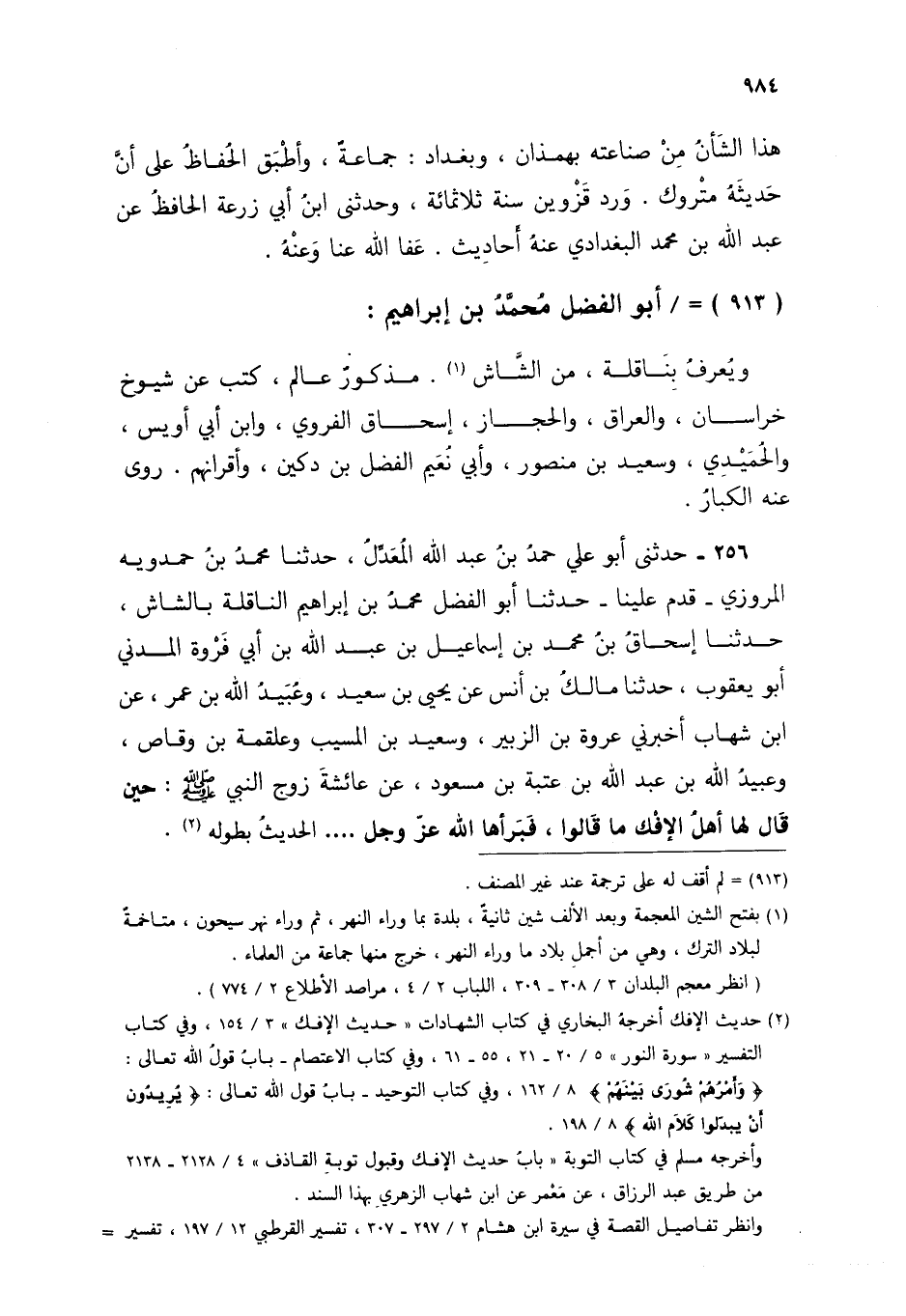 §أَبُو الْفَضْلِ مُحَمَّدُ بْنُ إِبْرَاهِيمَ وَيُعْرَفُ بِنَاقِلَةَ، مِنَ الشَّاشِ، مَذْكُورٌ عَالِمٌ، كَتَبَ عَنْ شُيُوخِ خُرَاسَانَ، وَالْعِرَاقِ، وَالْحِجَازِ إِسْحَاقَ الْفَرْوِيِّ، وَابْنِ أَبِي أُوَيْسٍ، وَالْحُمَيْدِيِّ، وَسَعِيدِ بْنِ مَنْصُورٍ، وَأَبِي نُعَيْمٍ الْفَضْلِ بْنِ دُكَيْنٍ، وَأَقْرَانِهِمْ رَوَى عَنْهُ الْكِبَارُ. حَدَّثَنِي أَبُو عَلِيٍّ حَمَدُ بْنُ عَبْدِ اللَّهِ الْمُعَدِّلُ، حَدَّثَنَا مُحَمَّدُ بْنُ حَمْدَوَيْهِ الْمَرْوَزِيُّ قَدِمَ عَلَيْنَا حَدَّثَنَا أَبُو الْفَضْلِ مُحَمَّدُ بْنُ إِبْرَاهِيمَ النَّاقِلَةُ بِالشَّاشِ حَدَّثَنَا إِسْحَاقُ بْنُ مُحَمَّدِ بْنِ إِسْمَاعِيلَ بْنِ عَبْدِ اللَّهِ بْنِ أَبِي فَرْوَةَ الْمَدَنِيُّ أَبُو يَعْقُوبَ حَدَّثَنَا مَالِكُ بْنُ أَنَسٍ عَنْ يَحْيَى بْنِ سَعِيدٍ، وَعُبَيْدِ اللَّهِ بْنِ عُمَرَ، عَنِ ابْنِ شِهَابٍ أَخْبَرَنِي عُرْوَةُ بْنُ الزُّبَيْرِ، وَسَعِيدُ بْنُ الْمُسَيِّبِ، وَعَلْقَمَةُ بْنُ وَقَّاصٍ، وَعُبَيْدُ اللَّهِ بْنُ عَبْدِ اللَّهِ بْنِ عُتْبَةَ بْنِ مَسْعُودٍ، عَنْ عَائِشَةَ، زَوْجِ النَّبِيِّ صَلَّى اللهُ عَلَيْهِ وَسَلَّمَ حِينَ قَالَ لَهَا أَهْلُ الْإِفْكِ مَا قَالُوا فَبَرَّأَهَا اللَّهُ عَزَّ وَجَلَّ الْحَدِيثُ بِطُولِهِ