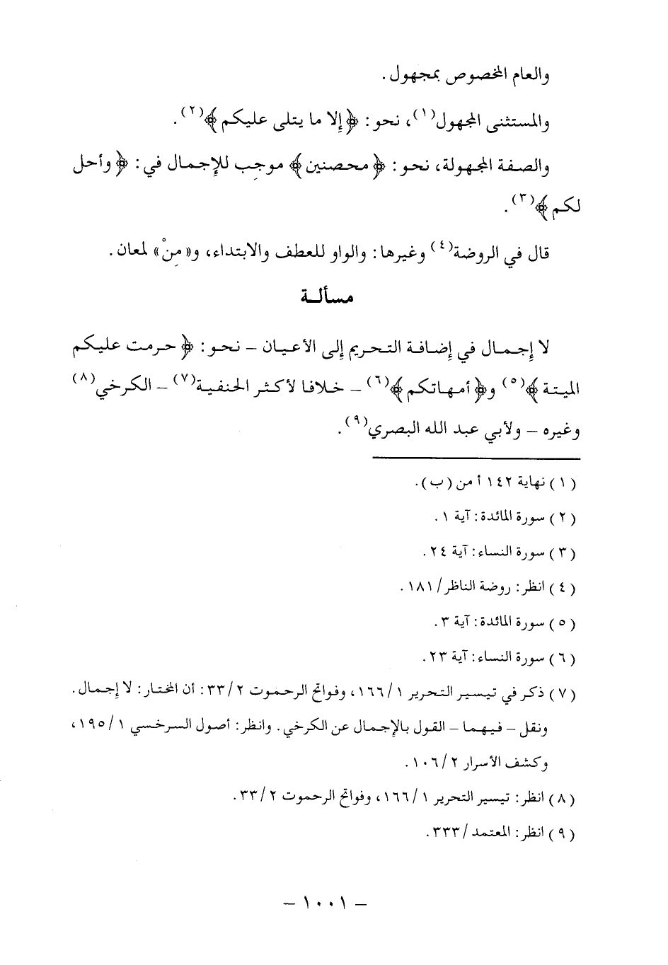 والصفة المجهولة، نحو: (محصنين) موجِب للإِجمال في: (وأحل لكم) (٣).