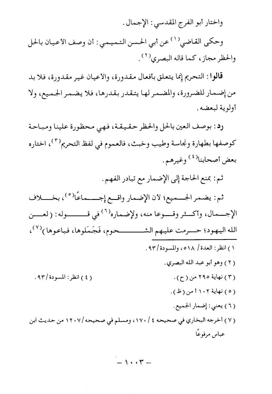 رد: بوصف العين بالحل والحظر حقيقة، فهي محظورة علينا ومباحة كوصفها بطهارة ونجاسة وطيب وخبث، فالعموم في لفظ التحريم (٣)، اختاره بعض أصحابنا (٤) وغيرهم.