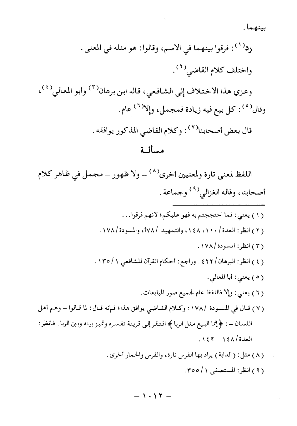 (٧) قال في المسودة/ ١٧٨: وكلام القاضي يوافق هذا؛ فإِنه قال: لما قال -وهم أهل اللسان-: (إِنما البيع مثل الربا) افتقر إِلى قرينة تفسره وتميز بينه وبين الربا. فانظر: لعدة/ ١٤٨ - ١٤٩.