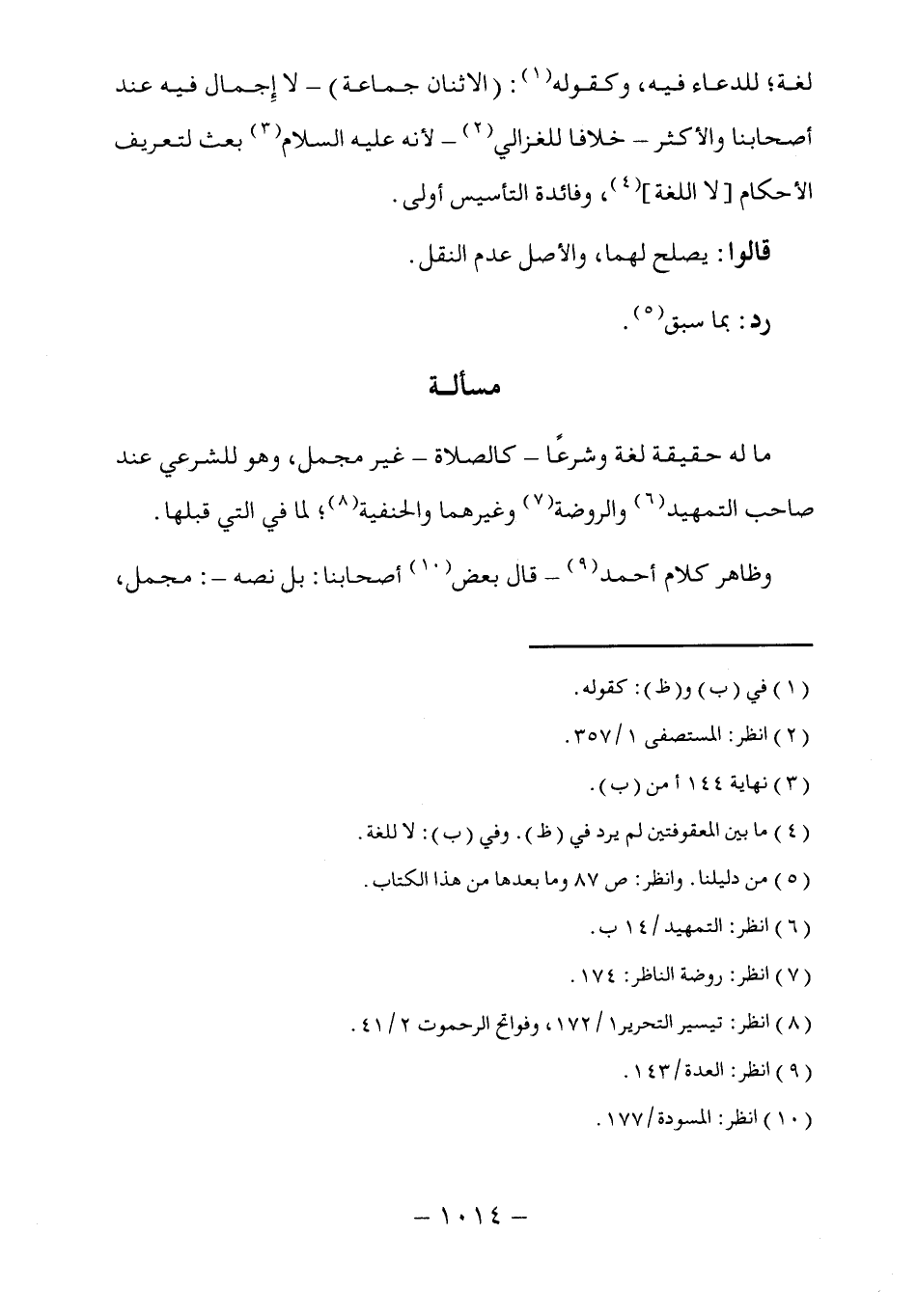 لغة؛ للدعاء فيه، وكقوله (١): (الاثنان جماعة) -لا إِجمال فيه عند أصحابنا والأكثر- خلافا للغزالي (٢) -لأنه عليه السلام (٣) بعث لتعريف الأحكام [لا اللغة] (٤)، وفائدة التأسيس أولى.