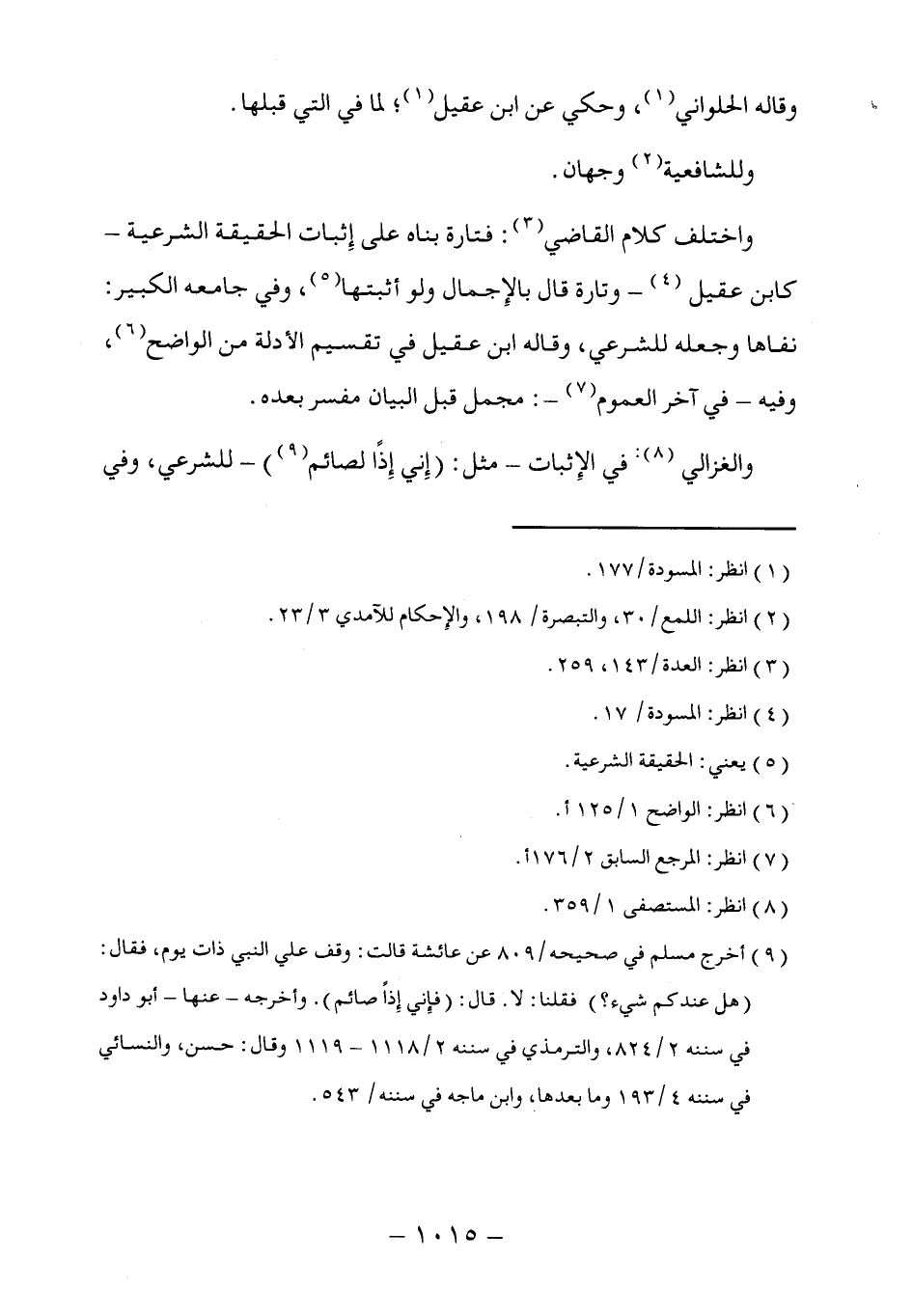 واختلفكلام القاضي (٣): فتارة بناه على إِثبات الحقيقة الشرعية -كابن عقيل (٤) - وتارة قال بالإِجمال ولو أثبتها (٥)، وفي جامعه الكبير: نفاها وجعله للشرعي، وقاله ابن عقيل في تقسيم الأدلة من الواضح (٦)، وفيه -في آخر العموم (٧) -: مجمل قبل البيان مفسر بعده.