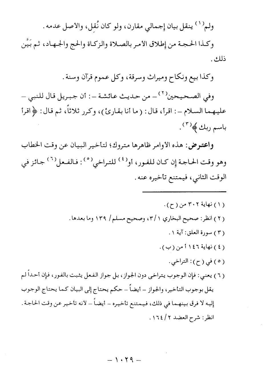 واعترض: هذه الأوامر ظاهرها متروك؛ لتأخير البيان عن وقت الخطاب وهو وقت الحاجة إِن كان للفور، أو (٤) للتراخي (٥): فالفعل (٦) جائز في الوقت الثاني، فيمتنع تأخيره عنه.