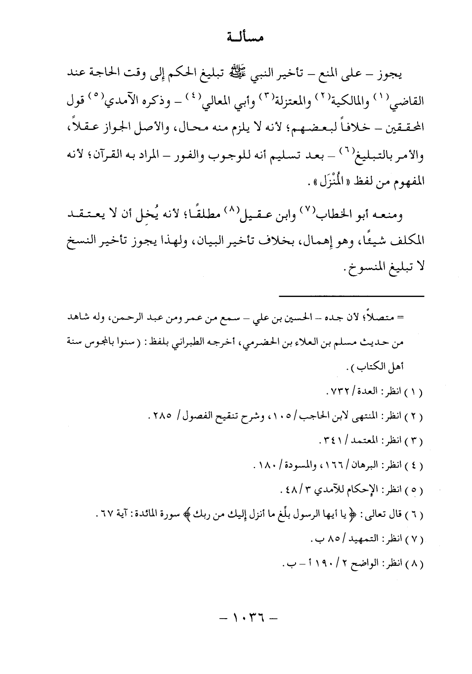 يجوز -على المنع- تأخير النبي - صلى الله عليه وسلم - تبليغ الحكم إِلى وقت الحاجة عند القاضي (١) والمالكية (٢) والمعتزلة (٣) وأبي المعالي (٤) -وذكره الآمدي (٥) قول المحققين- خلافاً لبعضهم؛ لأنه لا يلزم منه محال، والأصل الجواز عقلاً، والأمر بالتبليغ (٦) -بعد تسليم أنه للوجوب والفور- المراد به القرآن؛ لأنه المفهوم من لفظ "المُنزَل".