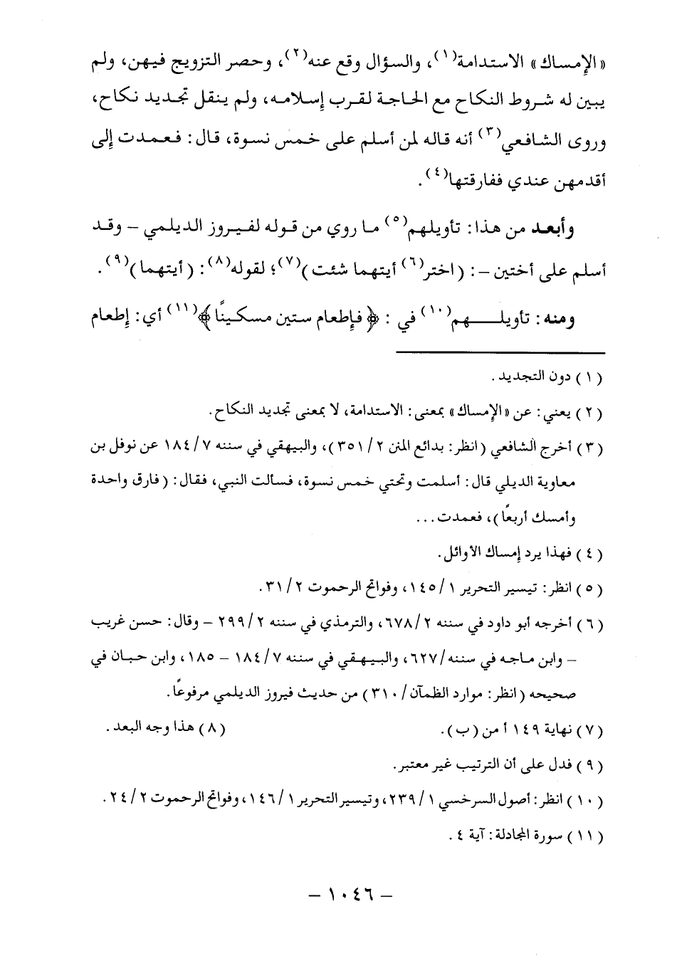 (٣) أخرج الشافعي (انظر: بدائع المنن ٢/ ٣٥١)، والبيهقي في سننه ٧/ ١٨٤ عن نوفل بن معاوية الديلمي قال: أسلمت وتحتي خمس نسوة، فسألت النبي، فقال: (فارق واحدة وأمسك أربعًا)، فعمدت ...