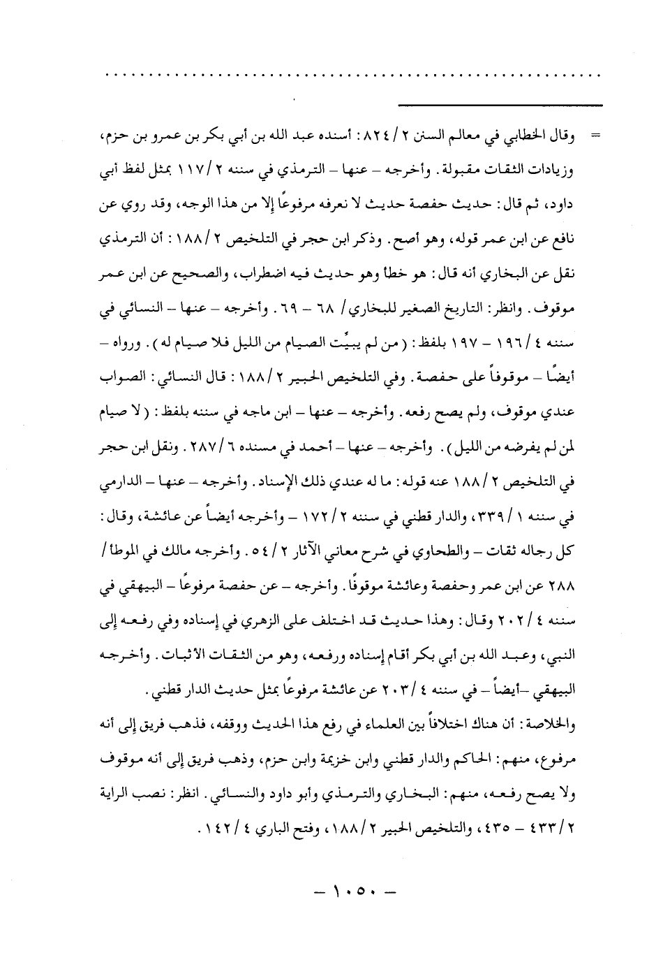 =وقال الخطابي في معالم السنن ٢/ ٨٢٤: أسنده عبد الله بن أبي بكر بن عمرو بن حزم، وزيادات الثقات مقبولة. وأخرجه -عنها- الترمذي في سننه ٢/ ١١٧ بمثل لفظ أبي داود، ثم قال: حديث حفصة حديث لا نعرفه مرفوعًا إِلا من هذا الوجه، وقد روي عن نافع عن ابن عمر قوله، وهو أصح. وذكر ابن حجر في التلخيص ٢/ ١٨٨: أن الترمذي نقل عن البخاري أنه قال: هو خطأ وهو حديث فيه اضطراب، والصحيح عن ابن عمر موقوف. وانظر: التاريخ الصغير للبخاري/ ٦٨ - ٦٩. وأخرجه -عنها- النسائي في سننه ٤/ ١٩٦ - ١٩٧ بلفظ: (من لم يبيّت الصيام من الليل فلا صيام له). ورواه -أيضاً- موقوفاً على حفصة. وفي التلخيص الحبير ٢/ ١٨٨: قال النسائي: الصواب عندي موقوف، ولم يصح رفعه. وأخرجه -عنها- ابن ماجه في سننه بلفظ: (لا صيام لمن لم يفرضه من الليل). وأخرجه -عنها- أحمد في مسنده ٦/ ٢٨٧. ونقل ابن حجر في التلخيص ٢/ ١٨٨ عنه قوله: ما له عندي ذلك الإِسناد. وأخرجه -عنها- الدارمي في سننه ١/ ٣٣٩، والدارقطني في سننه ٢/ ١٧٢ - وأخرجه أيضاً عن عائشة، وقال: كل رجاله ثقات- والطحاوي في شرح معاني الآثار ٢/ ٥٤. وأخرجه مالك في الموطأ/ ٢٨٨ عن ابن عمر وحفصة وعائشة موقوفًا. وأخرجه -عن حفصة مرفوعًا- البيهقي في سننه ٤/ ٢٠٢ وقال: وهذا حديث قد اختلف على الزهري في إِسناده وفي رفعه إِلى النبي، وعبد الله بن أبي بكر أقام إِسناده ورفعه، وهو من الثقات الأثبات. وأخرجه البيهقي -أيضاً- في سننه ٤/ ٢٠٣ عن عائشة مرفوعًا بمثل حديث الدارقطني.