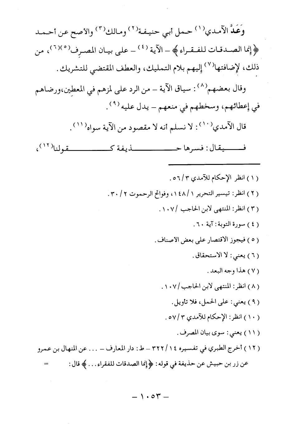 وَعَدَّ الآمدي (١) حمل أبي حنيفة (٢) ومالك (٣) والأصح عن أحمد (إنما الصدقات للفقراء) -الآية (٤) - على بيان المصرِف (٥) (٦)، من ذلك، لإِضافتها (٧) إِليهم بلام التمليك، والعطف المقتضي للتشريك.