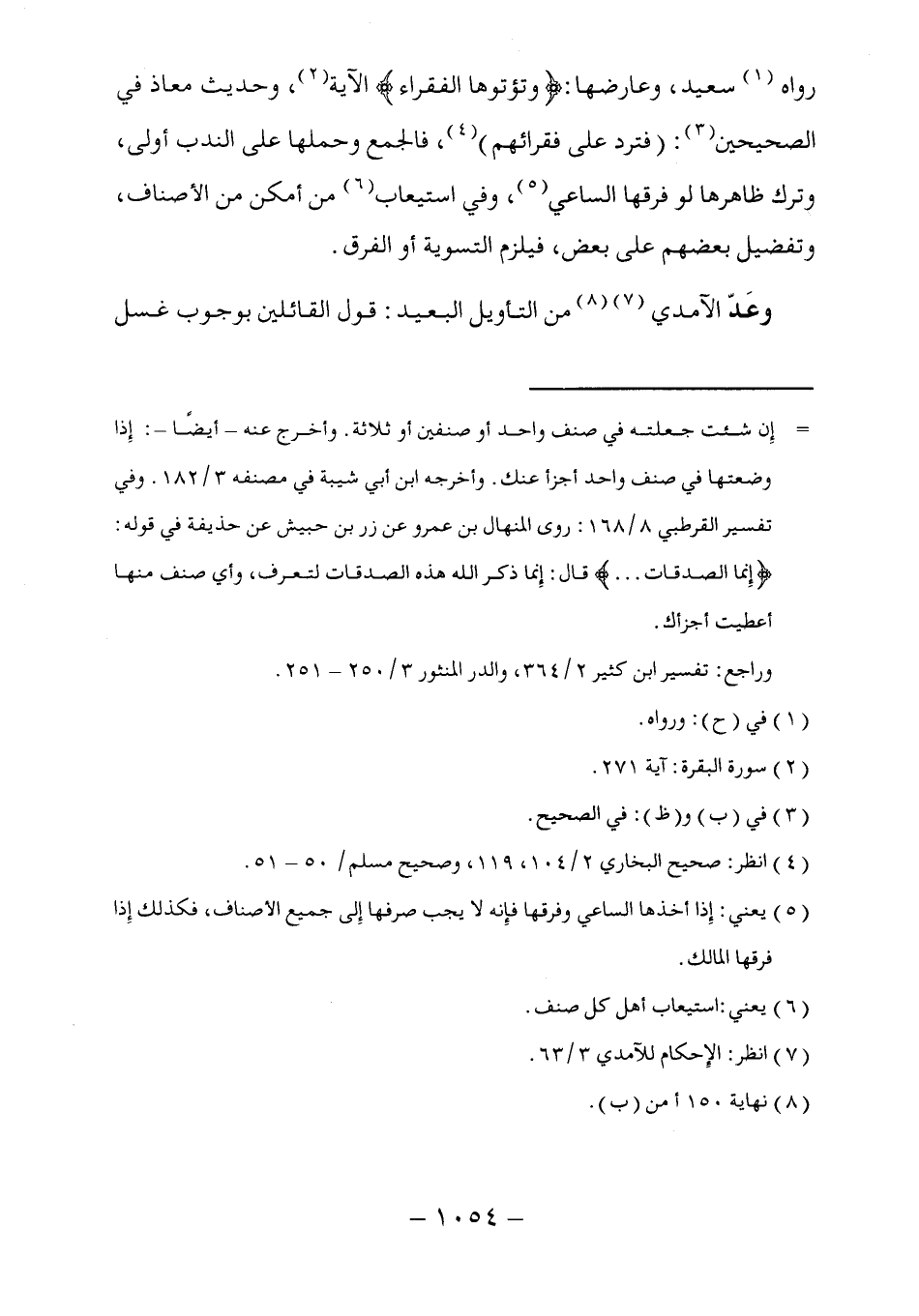 =إِن شئت جعلته في صنف واحد أو صنفين أو ثلاثة. وأخرج عنه -أيضاً-: إِذا وضعتها في صنف واحد أجزأ عنك. وأخرجه ابن أبي شيبة في مصنفه ٣/ ١٨٢. وفي تفسير القرطبي ٨/ ١٦٨: روى المنهال بن عمرو عن زر بن حبيش عن حذيفة في قوله: (إِنما الصدقات ...) قال: إِنما ذكر الله هذه الصدقات لتعرف، وأي صنف منها أعطيت أجزأك.