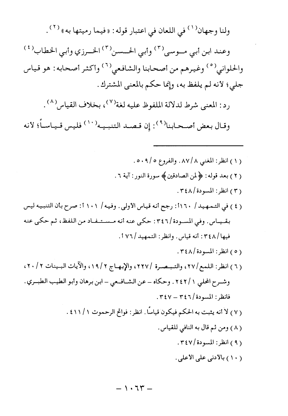 (٤) في التمهيد/ ١٦٠أ: رجح أنه قياس الأولى. وفيه / ١٠١أ: صرح بأن التنبيه ليس بقياس. وفي المسودة/ ٣٤٦: حكى عنه أنه مستفاد من اللفظ، ثم حكى عنه فيها/ ٣٤٨: أنه قياس. وانظر: التمهيد/ ٧٦أ.