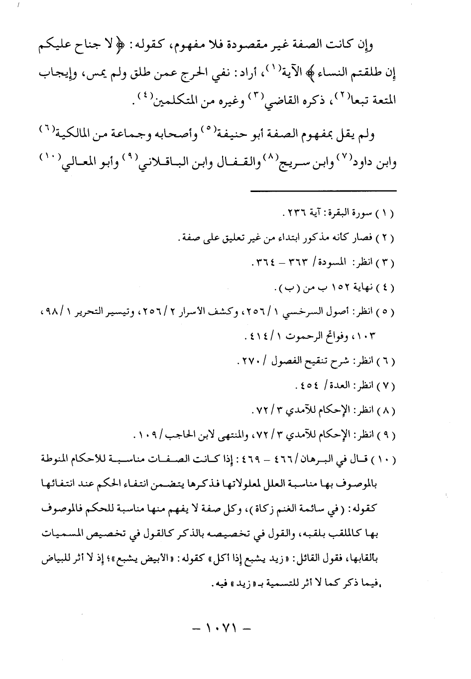 ولم يقل بمفهوم الصفة أبو حنيفة (٥) وأصحابه وجماعة من المالكية (٦) وابن داود (٧) وابن سريج (٨) والقفال وابن الباقلاني (٩) وأبو المعالي (١٠)