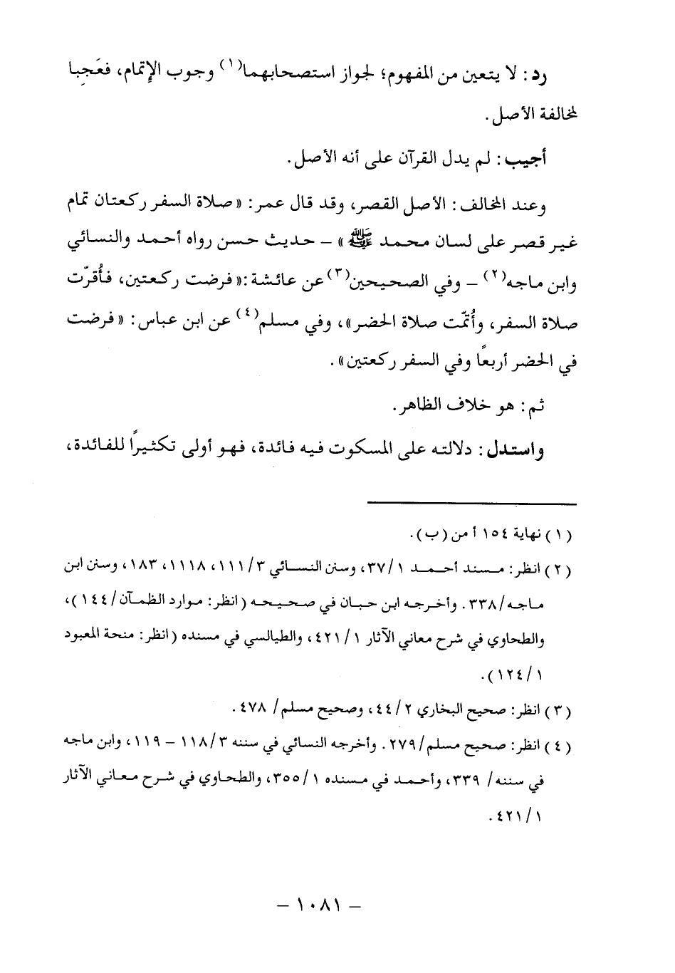رد: لا يتعين من المفهوم، لجواز استصحابهما (١) وجوب الإِتمام، فعَجِبا لمخالفة الأصل.
