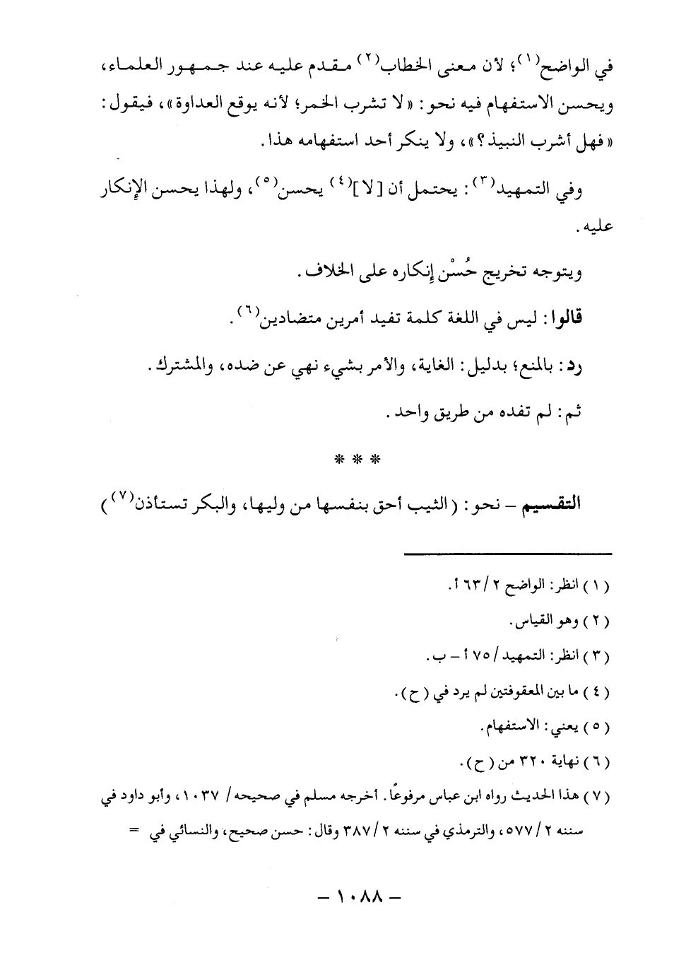 في الواضح (١)؛ لأن معنى الخطاب (٢) مقدم عليه عند جمهور العلماء، ويحسن الاستفهام فيه نحو: "لا تشرب الخمر؛ لأنه يوقع العداوة"، فيقول: "فهل أشرب النبيذ؟ "، ولا ينكر أحد استفهامه هذا.