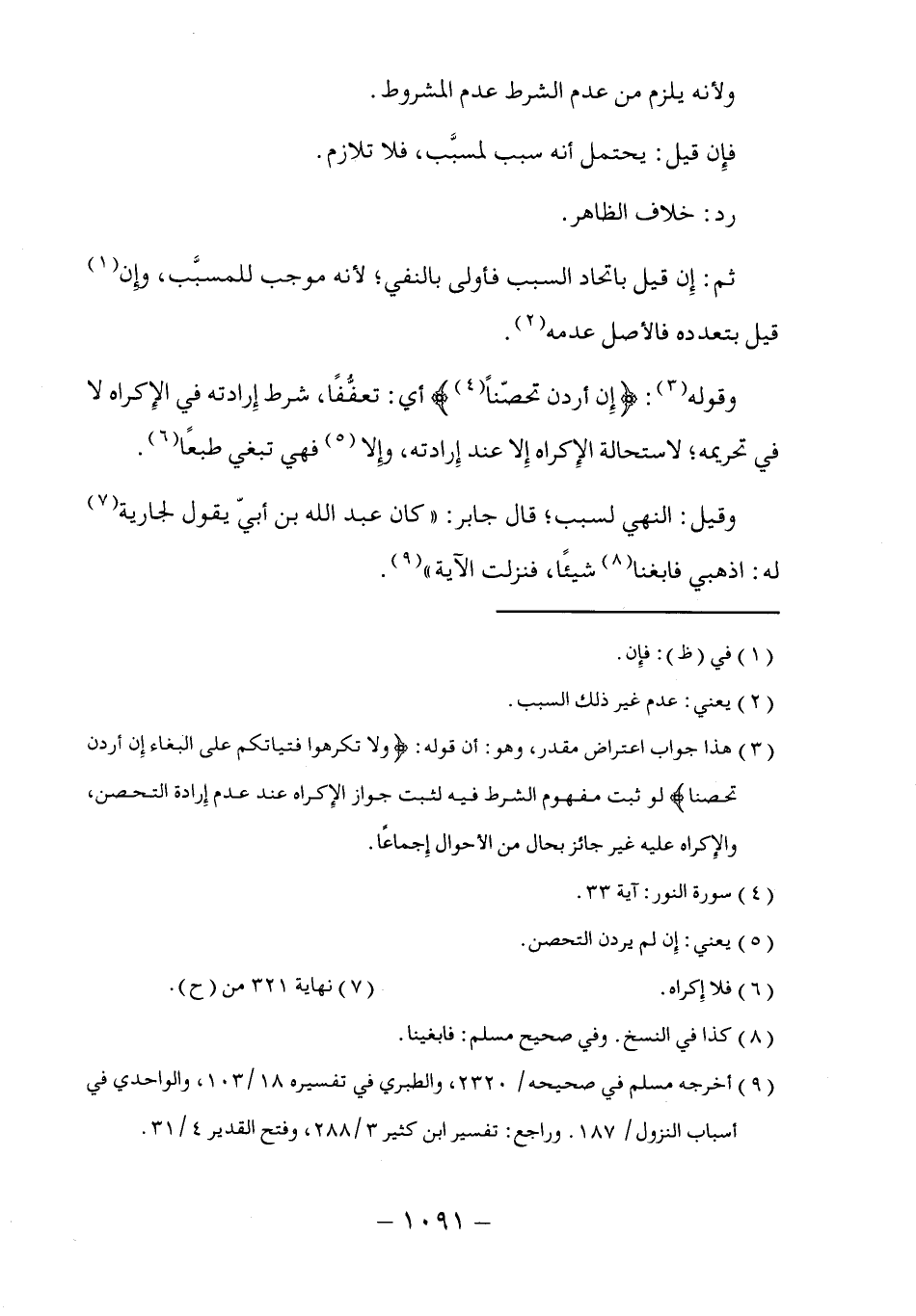 (٣) هذا جواب اعتراض مقدر، وهو: أن قوله: (ولا تكرهوا فتياتكم على البغاء إِن أردن تحصنا) لو ثبت مفهوم الشرط فيه لثبت جواز الإِكراه عند عدم إِرادة التحصن، والإِكراه عليه غير جائز بحال من الأحوال إِجماعًا.