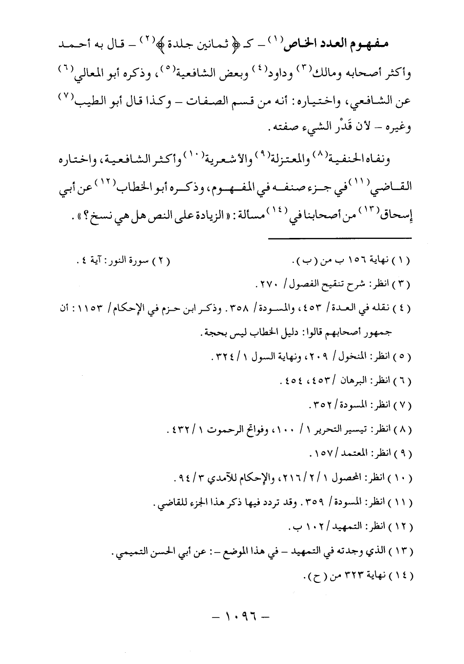 مفهوم العدد الخاص (١) -كـ (ثمانين جلدة) (٢) - قال به أحمد وأكثر أصحابه ومالك (٣) وداود (٤) وبعض الشافعية (٥)، وذكره أبو المعالي (٦) عن الشافعي، واختياره: أنه من قسم الصفات -وكذا قال أبو الطيب (٧) وغيره- لأن قَدْر الشيء صفته.