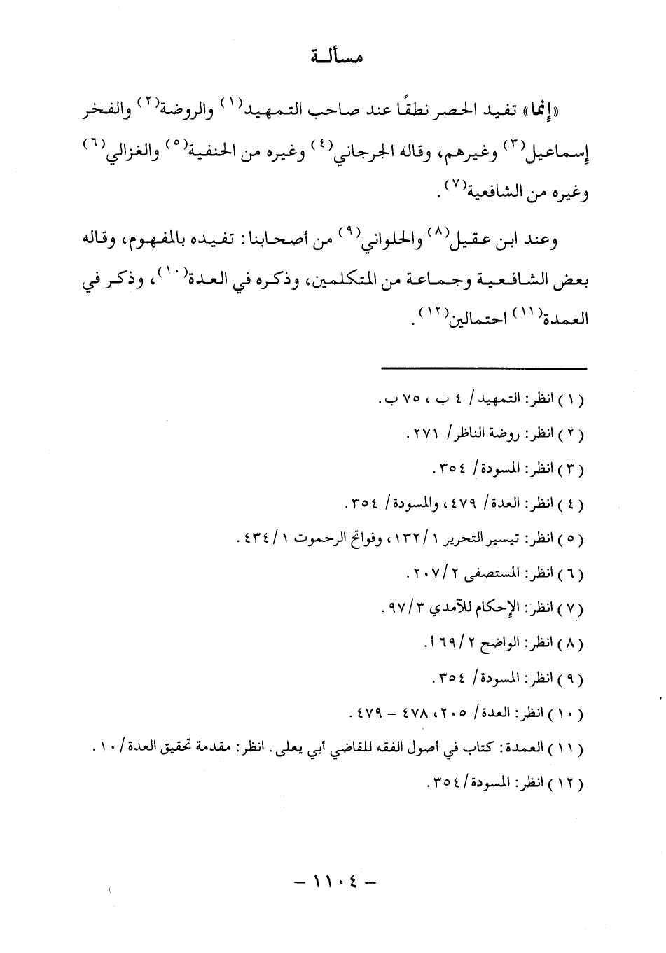 وعند ابن عقيل (٨) والحلواني (٩) من أصحابنا: تفيده بالمفهوم، وقاله بعض الشافعية وجماعة من المتكلمين، وذكره في العدة (١٠)، وذكر في العمدة (١١) احتمالين (١٢).