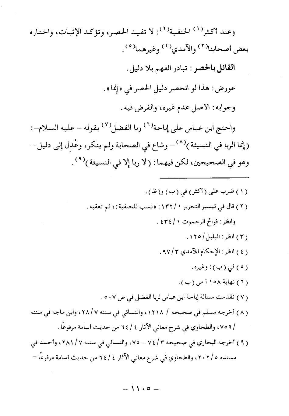 واحتج ابن عباس على إِباحة (٦) ربا الفضل (٧) بقوله - عليه السلام -: (إِنما الربا في النسيئة) (٨) -وشاع في الصحابة ولم ينكر، وعُدِل إِلى دليل- وهو في الصحيحين، لكن فيهما: (لا ربا إِلا في النسيئة) (٩).