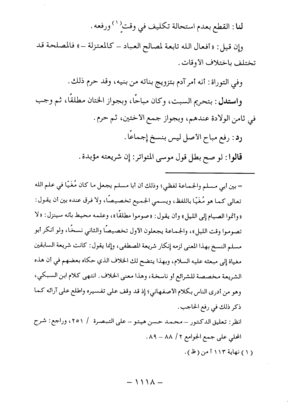 =بين أبي مسلم والجماعة لفظي؛ وذلك أن أبا مسلم يجعل ما كان مُغَيّا في علم الله تعالى كما هو مُغَيّا باللفظ، ويسمي الجميع تخصيصًا، ولا فرق عنده بين أن يقول: "وأتموا الصيام إِلى الليل" وأن يقول: "صوموا مطلقًا"، وعلمه محيط بأنه سينزل: "لا تصوموا وقت الليل"، والجماعة يجعلون الأول تخصيصًا والثاني نسخًا، ولو أنكر أبو مسلم النسخ بهذا المعنى لزمه إِنكار شريعة المصطفى، وإنما يقول: كانت شريعة السابقين مغياة إِلى مبعثه عليه السلام، وبهذا يتضح لك الخلاف الذي حكاه بعضهم في أن هذه الشريعة مخصصة للشرائع أو ناسخة، وهذا معنى الخلاف. انتهى كلام ابن السبكي، وهو من أدرى الناس بكلام الأصفهاني؛ إِذ قد وقف على تفسيره واطلع على آرائه كما ذكر ذلك في رفع الحاجب.
