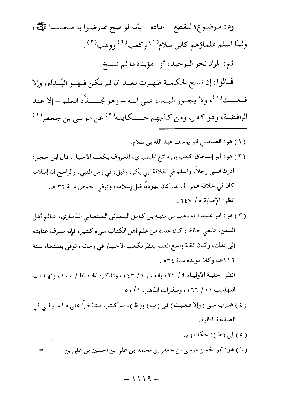 قالوا: إِن نسخ لحكمة ظهرت بعد أن لم تكن فهو البَدَاء، وإلا فعبث (٤)، ولا يجوز البداء على الله -وهو تجدّد العلم- إِلا عند الرافضة، وهو كفر، ومن كذبهم حكايته (٥) عن موسى بن جعفر (٦)