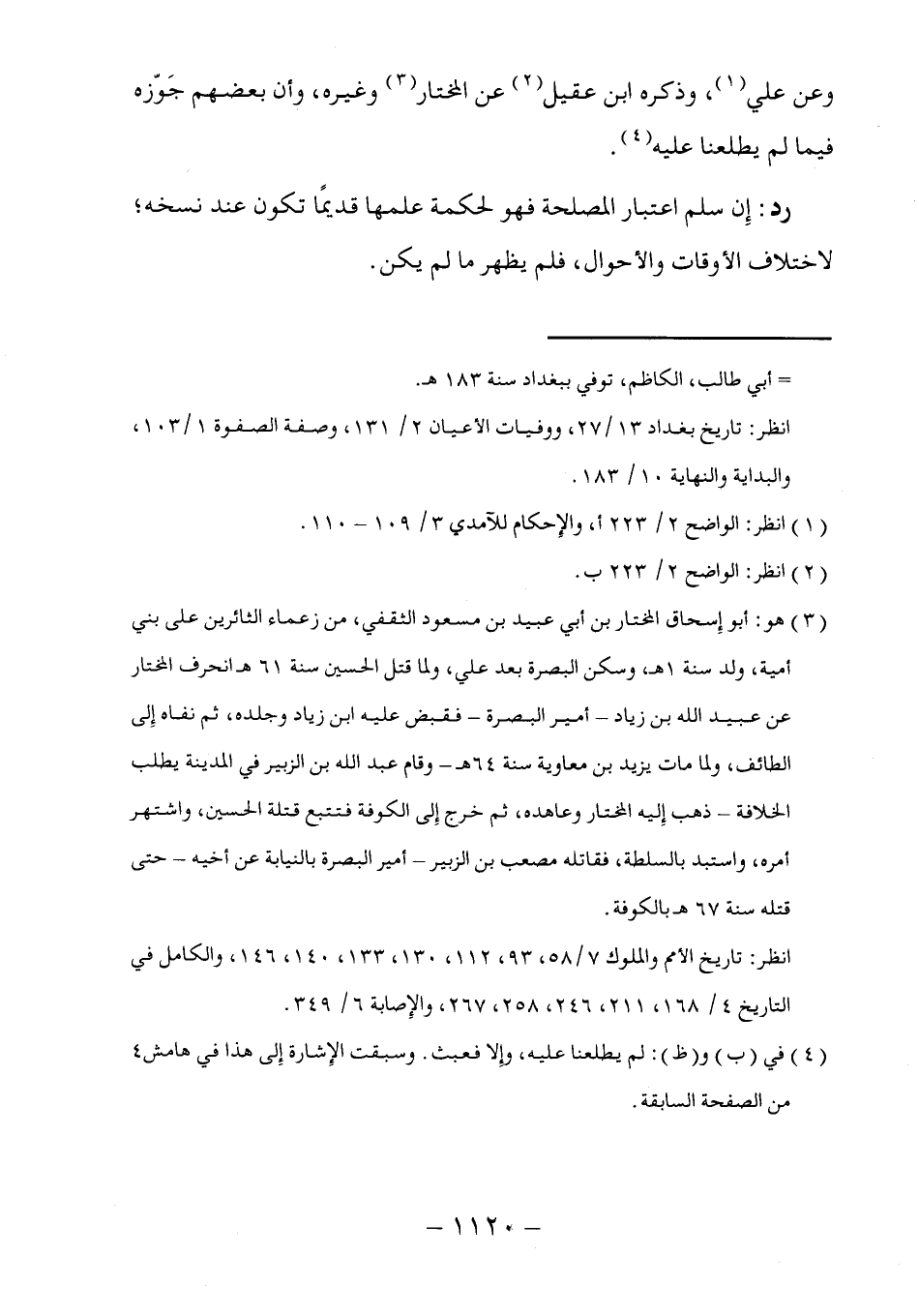 (٣) هو: أبو إِسحاق المختار بن أبي عبيد بن مسعود الثقفي، من زعماء الثائرين على بني أمية، ولد سنة اهـ، وسكن البصرة بعد علي، ولما قتل الحسين سنة ٦١ هـ انحرف المختار عن عبيد الله بن زياد -أمير البصرة- فقبض عليه ابن زياد وجلده، ثم نفاه إِلى الطائف، ولما مات يزيد بن معاوية سنة ٦٤ هـ -وقام عبد الله بن الزبير في المدينة يطلب الخلافة- ذهب إِليه المختار وعاهده، ثم خرج إِلى الكوفة فتتبع قتلة الحسين، واشتهر أمره، واستبد بالسلطة، فقاتله مصعب بن الزبير- أمير البصرة بالنيابة عن أخيه- حتى قتله سنة ٦٧ هـ بالكوفة.