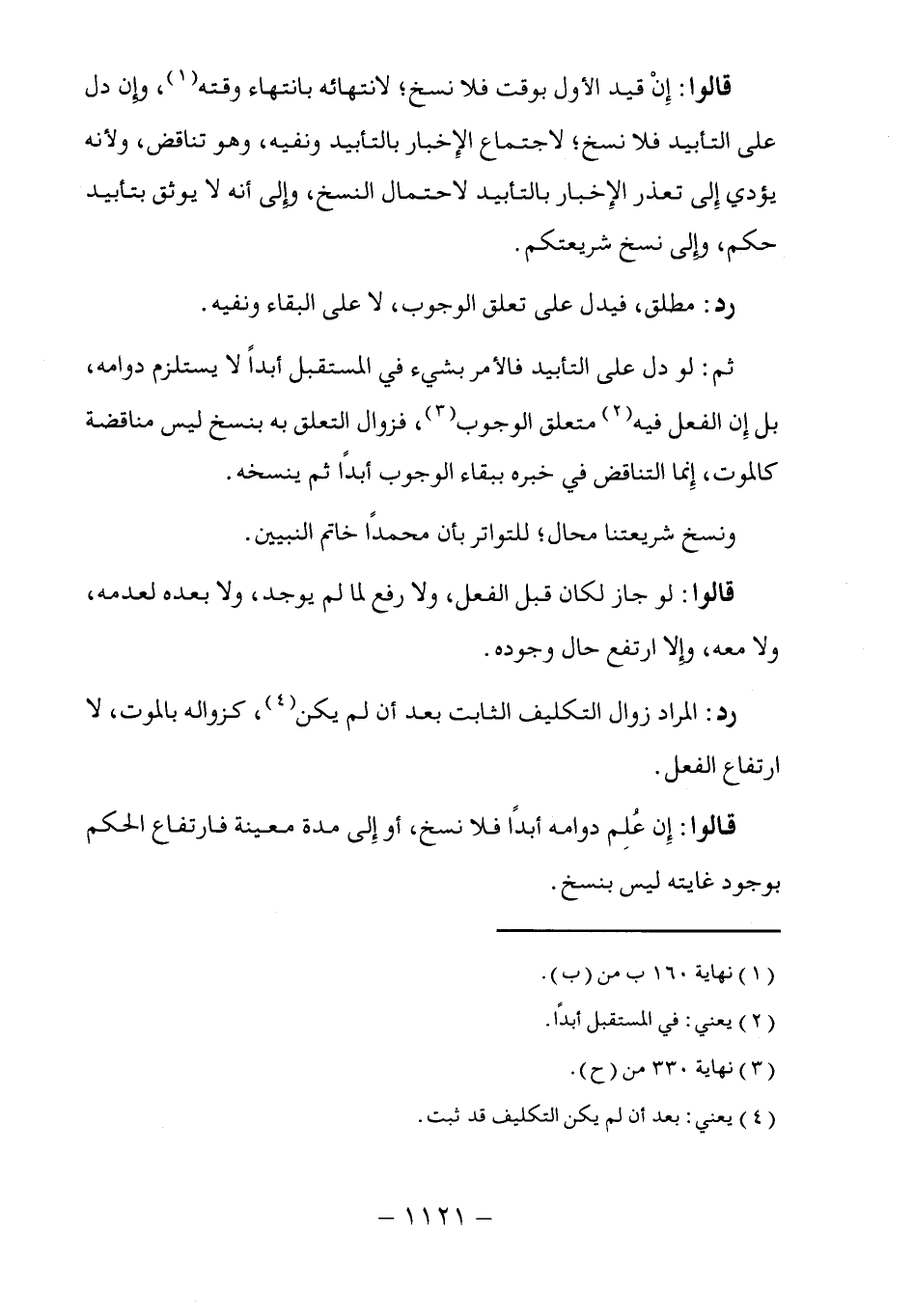 قالوا: إِنْ قيد الأول بوقت فلا نسخ؛ لانتهائه بانتهاء وقته (١)، وإن دل على التأبيد فلا نسخ؛ لاجتماع الإِخبار بالتأبيد ونفيه، وهو تناقض، ولأنه يؤدي إِلى تعذر الإِخبار بالتأبيد لاحتمال النسخ، وإلى أنه لا يوثق بتأبيد حكم، وإلى نسخ شريعتكم.