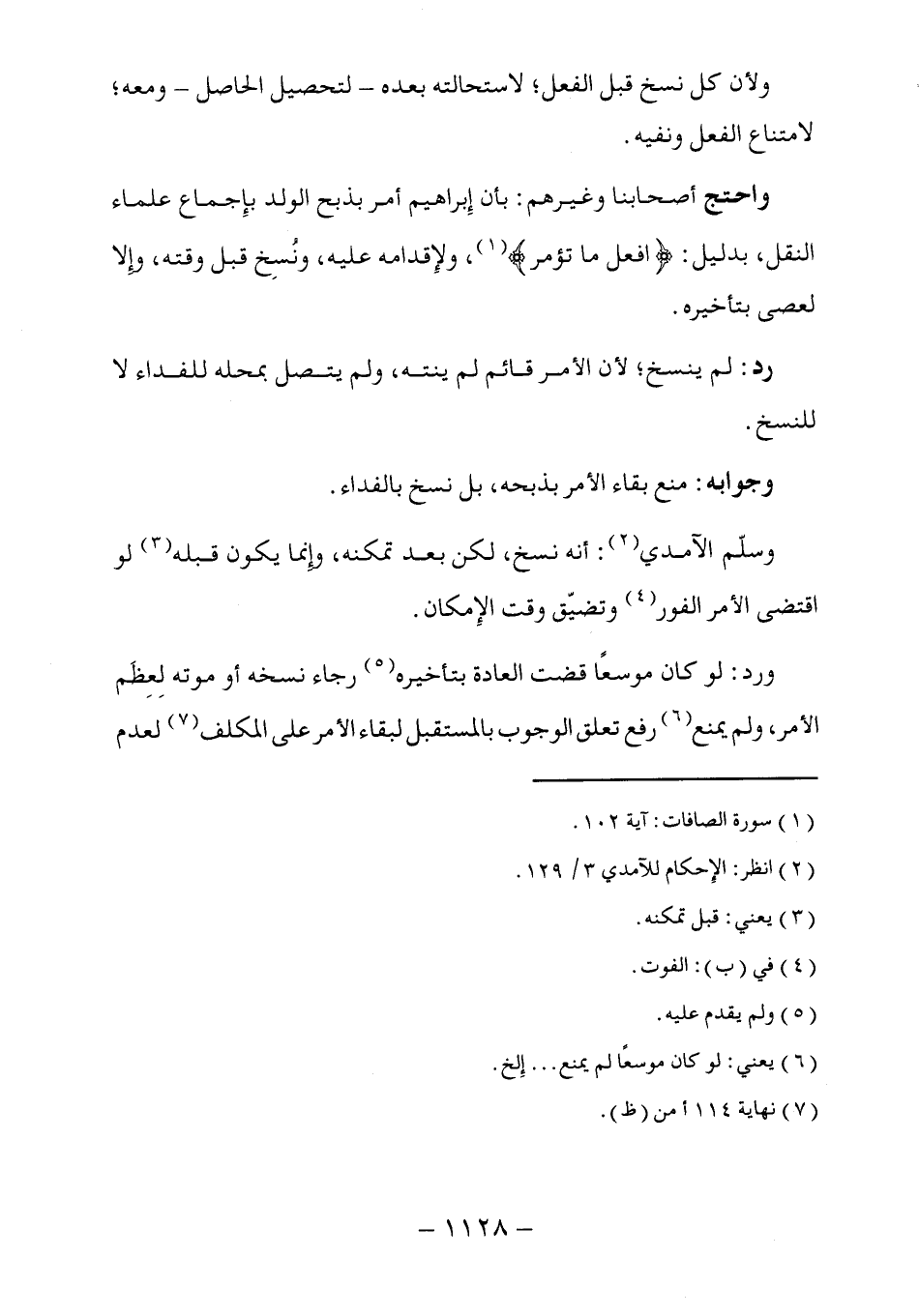 واحتج أصحابنا وغيرهم: بأن إِبراهيم أمر بذبح الولد بإِجماع علماء النقل، بدليل: (افعل ما تؤمر) (١)، ولإِقدامه عليه، ونُسِخ قبل وقته، وإلا لعصى بتأخيره.