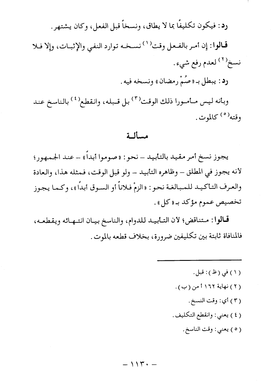 قالوا: متناقض؛ لأن التأبيد للدوام، والناسخ بيان انتهائه ويقطعه، فالمنافاة ثابتة بين تكليفين ضرورة، بخلاف قطعه بالموت.