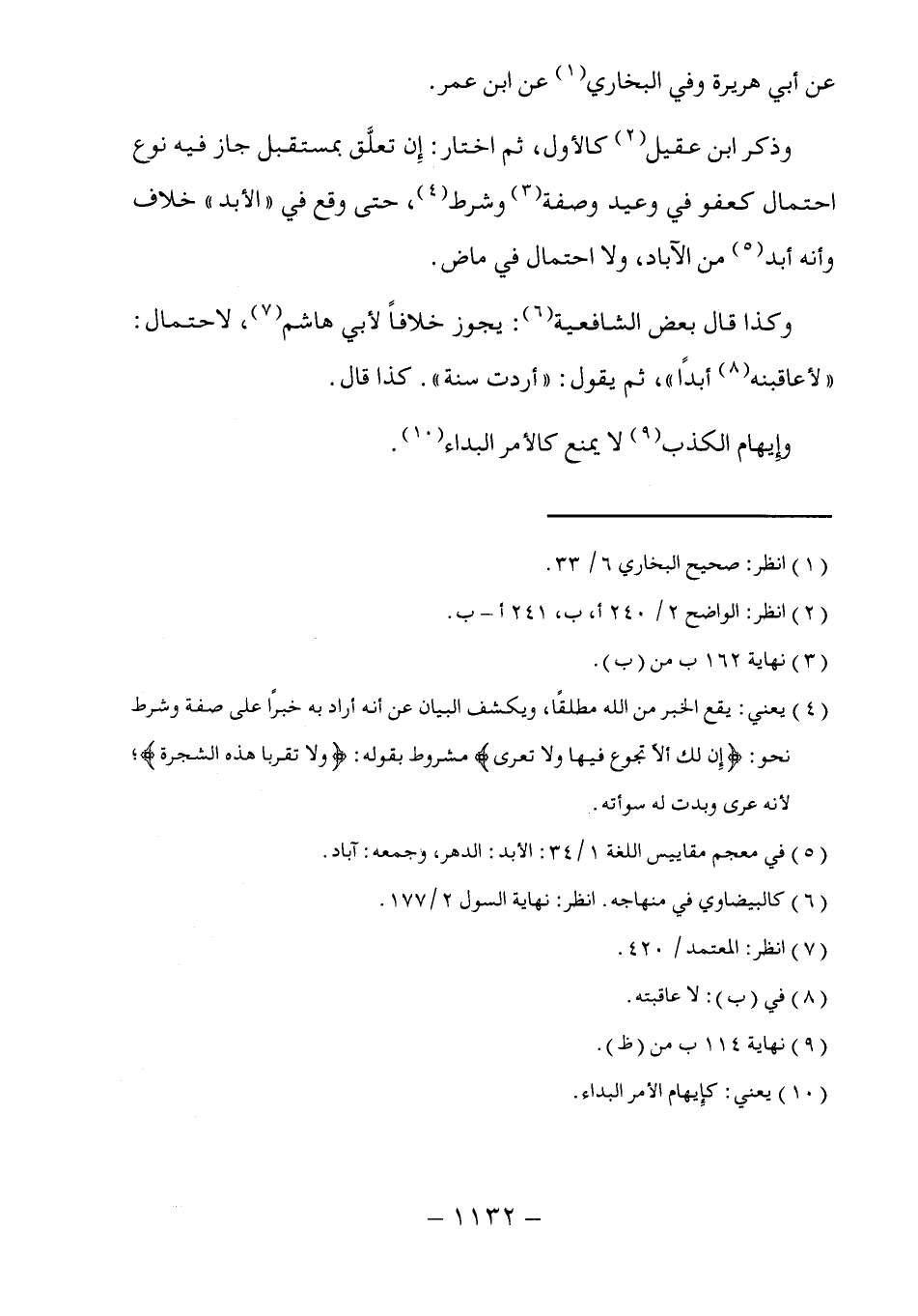 (٤) يعني: يقع الخبر من الله مطلقًا، ويكشف البيان عن أنه أراد به خبرًا على صفة وشرط نحو: (إِن لك ألا تجوع فيها ولا تعرى) مشروط بقوله: (ولا تقربا هذه الشجرة)؛ لأنه عرى وبدت له سوأته.
