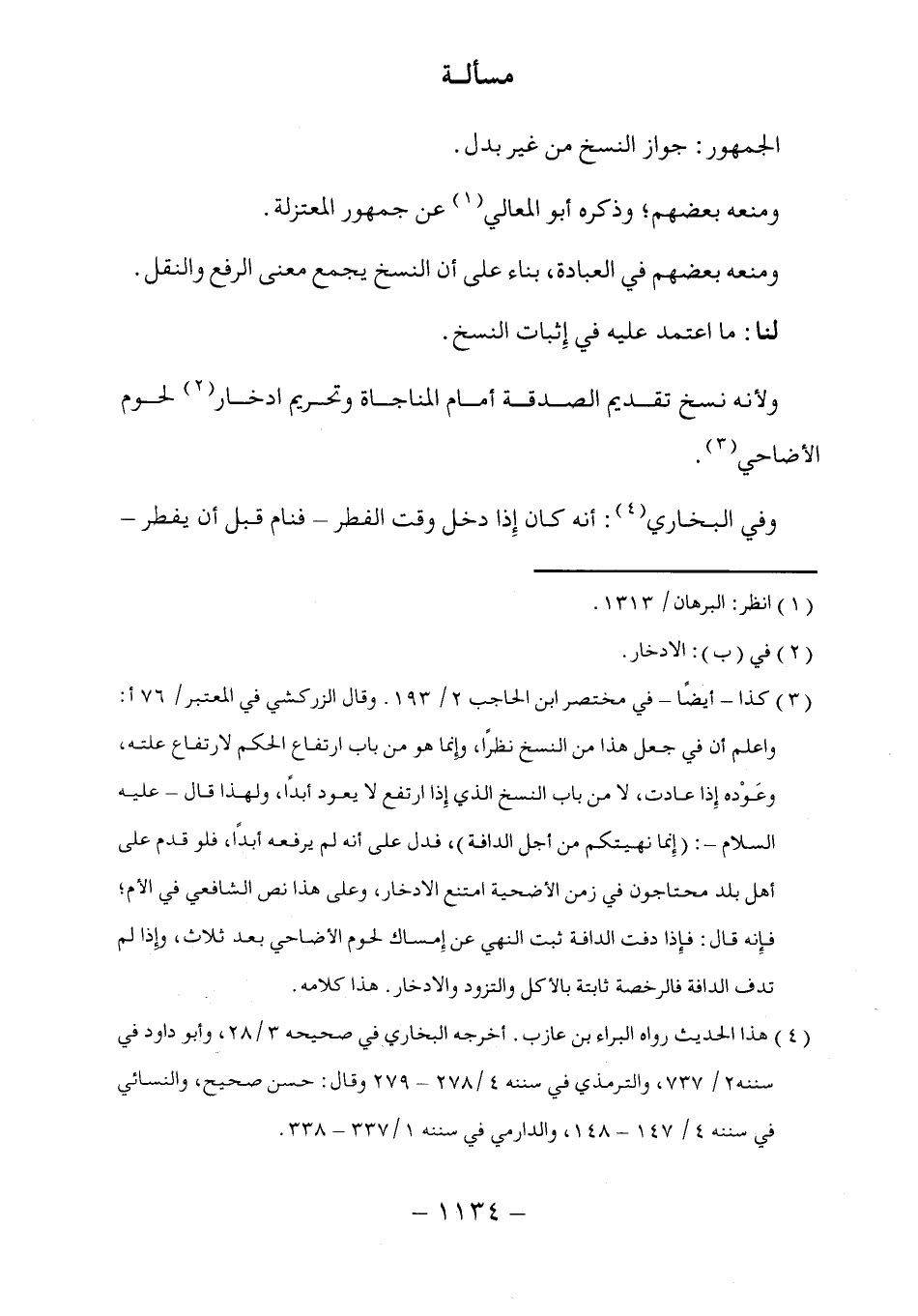(٣) كذا -أيضًا- في مختصر ابن الحاجب ٢/ ١٩٣. وقال الزركشي في المعتبر/ ٧٦ أ: واعلم أن في جعل هذا من النسخ نظرًا، وإنما هو من باب ارتفاع الحكم لارتفاع علته، وعَوْده إِذا عادت، لا من باب النسخ الذي إِذا ارتفع لا يعود أبدًا، ولهذا قال - عليه السلام -: (إِنما نهيتكم من أجل الدافة)، فدل على أنه لم يرفعه أبدًا، فلو قدم على أهل بلد محتاجون في زمن الأضحية امتنع الادخار، وعلى هذا نص الشافعي في الأم؛ فإِنه قال: فإِذا دفت الدافة ثبت النهي عن إِمساك لحوم الأضاحي بعد ثلاث، وإذا لم تدف الدافة فالرخصة ثابتة بالأ كل والتزود والادخار. هذا كلامه.