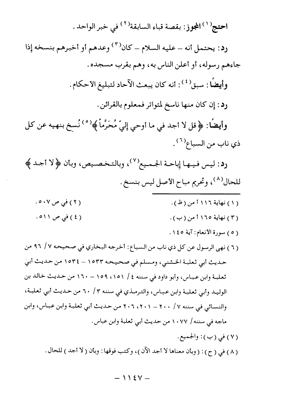 (٦) نهى الرسول عن كل ذي ناب من السباع: أخرجه البخاري في صحيحه ٧/ ٩٦ من حديث أبي ثعلبة الخشني، ومسلم في صحيحه ١٥٣٣ - ١٥٣٤ من حديث أبي ثعلبة وابن عباس، وأبو داود في سننه ٤/ ١٥١، ١٥٩ - ١٦٠ من حديث خالد بن الوليد وأبي ثعلبة وابن عباس، والترمذي في سننه ٣/ ٦٠ من حديث أبي ثعلبة، والنسائي في سننه ٧/ ٢٠٠ - ٢٠١، ٢٠٦ من حديث أبي ثعلبة وابن عباس، وابن ماجه في سننه / ١٠٧٧ من حديث أبي ثعلبة وابن عباس.