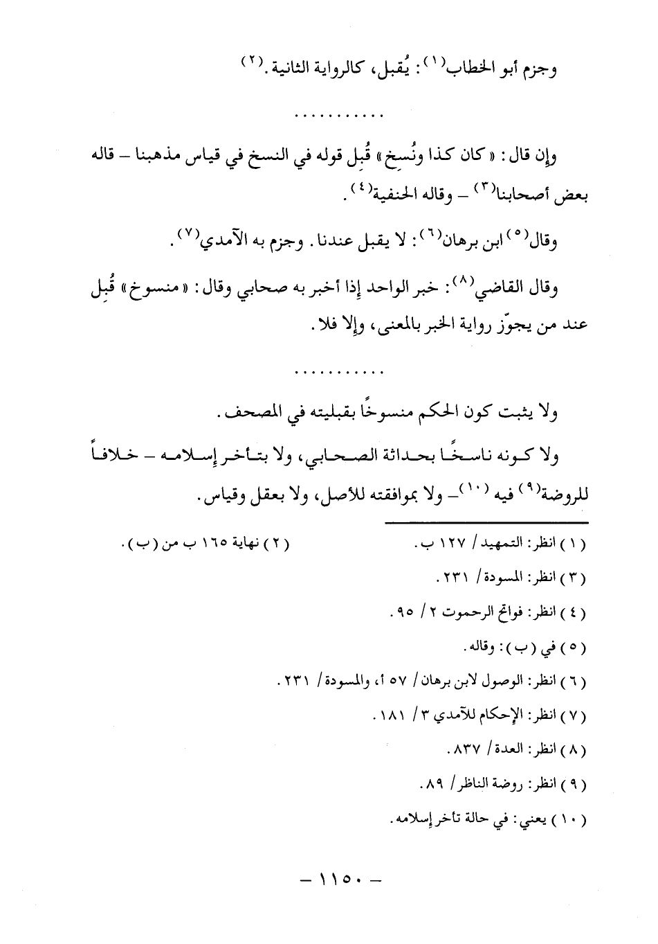 وقال القاضي (٨): خبر الواحد إِذا أخبر به صحابي وقال: "منسوخ" قُبِل عند من يجوّز رواية الخبر بالمعنى، وإِلا فلا.
