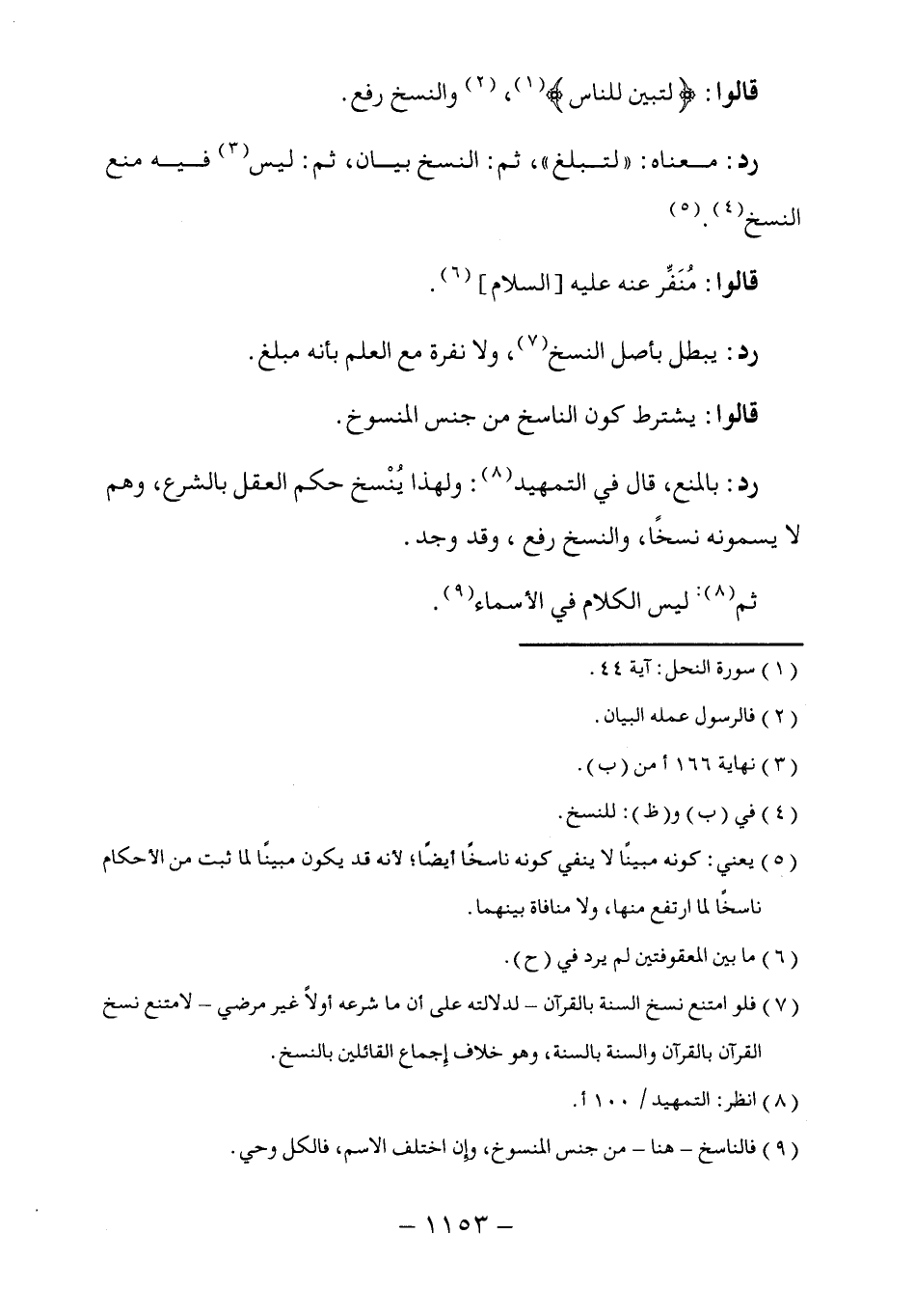(٥) يعني: كونه مبينًا لا ينفي كونه ناسخًا أيضاً؛ لأنه قد يكون مبينًا لما ثبت من الأحكام ناسخًا لما ارتفع منها، ولا منافاة بينهما.