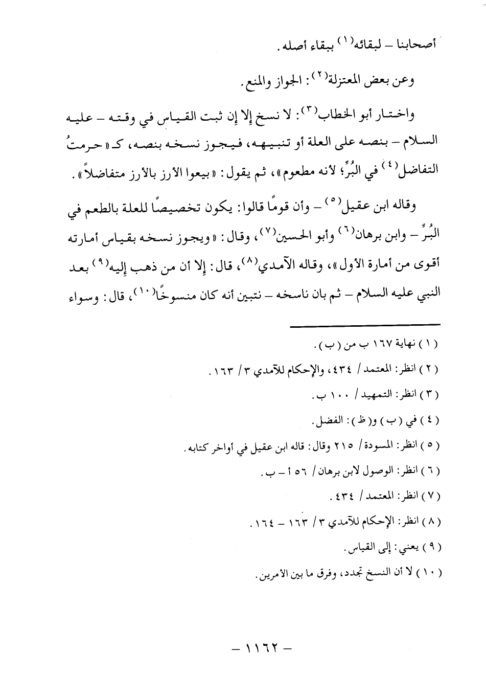 واختار أبو الخطاب (٣): لا نسخ إِلا إِن ثبت القياس في وقته -عليه السلام- بنصه على العلة أو تنبيهه، فيجوز نسخه بنصه، كـ "حرمتُ التفاضل (٤) في البُرِّ؛ لأنه مطعوم"، ثم يقول: "بيعوا الأرز بالأرز متفاضلاً".