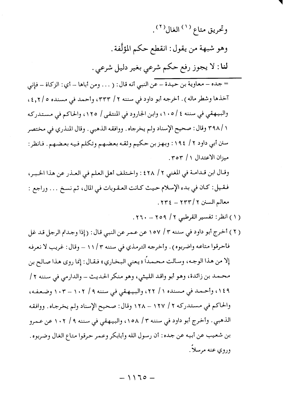 (٢) أخرج أبو داود في سننه ٣/ ١٥٧ عن عمر عن النبي قال: (إِذا وجدتم الرجل قد غل فأحرقوا متاعه واضربوه). وأخرجه الترمذي في سننه ٣/ ١١ - وقال: غريب لا نعرفه إِلا من هذا الوجه، وسألت محمدًا "يعني البخاري" فقال: إِنما روى هذا صالح بن محمَّد بن زائدة، وهو أبو واقد الليثي، وهو منكر الحديث - والدارمي في سننه ٢/ ١٤٩، وأحمد في مسنده ١/ ٢٢، والبيهقي في سننه ٩/ ١٠٢ - ١٠٣ وضعفه، والحاكم في مستدركه ٢/ ١٢٧ - ١٢٨ وقال: صحيح الإِسناد ولم يخرجاه. ووافقه الذهبي. وأخرج أبو داود في سننه ٣/ ١٥٨، والبيهقي في سننه ٩/ ١٠٢ عن عمرو بن شعيب عن أبيه عن جده: أن رسول الله وأبا بكر وعمر حرقوا متاع الغال وضربوه. وروي عنه مرسلاً.