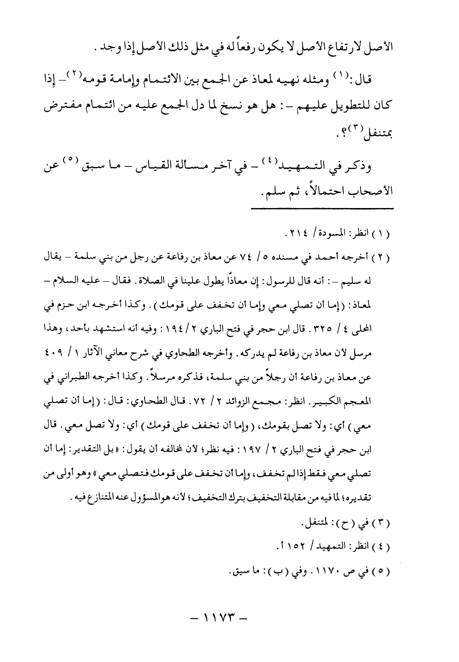 (٢) أخرجه أحمد في مسنده ٥/ ٧٤ عن معاذ بن رفاعة عن رجل من بني سلمة -يقال له سليم-: أنه قال للرسول: إِن معاذًا يطول علينا في الصلاة. فقال - عليه السلام - لمعاذ: (إِما أن تصلي معي وإما أن تخفف على قومك). وكذا أخرجه ابن حزم في المحلى ٤/ ٣٢٥. قال ابن حجر في فتح الباري ٢/ ١٩٤: وفيه أنه استشهد بأحد، وهذا مرسل لأن معاذ بن رفاعة لم يدركه. وأخرجه الطحاوي في شرح معاني الآثار ١/ ٤٠٩ عن معاذ بن رفاعة أن رجلاً من بني سلمة، فذكره مرسلاً. وكذا أخرجه الطبراني في المعجم الكبير. انظر: مجمع الزوائد ٢/ ٧٢. قال الطحاوي: قال: (إِما أن تصلي معي) أي: ولا تصل بقومك، (وإما أن تخفف على قومك) أي: ولا تصل معي. قال ابن حجر في فتح الباري ٢/ ١٩٧: فيه نظر؛ لأن لمخالفه أن يقول: "بل التقدير: إِما أن تصلي معي فقط إِذا لم تخفف، وإما أن تخفف على قومك فتصلي معي" وهو أولى من تقديره؛ لما فيه من مقابلة التخفيف بترك التخفيف؛ لأنه هو المسؤول عنه المتنازع فيه.
