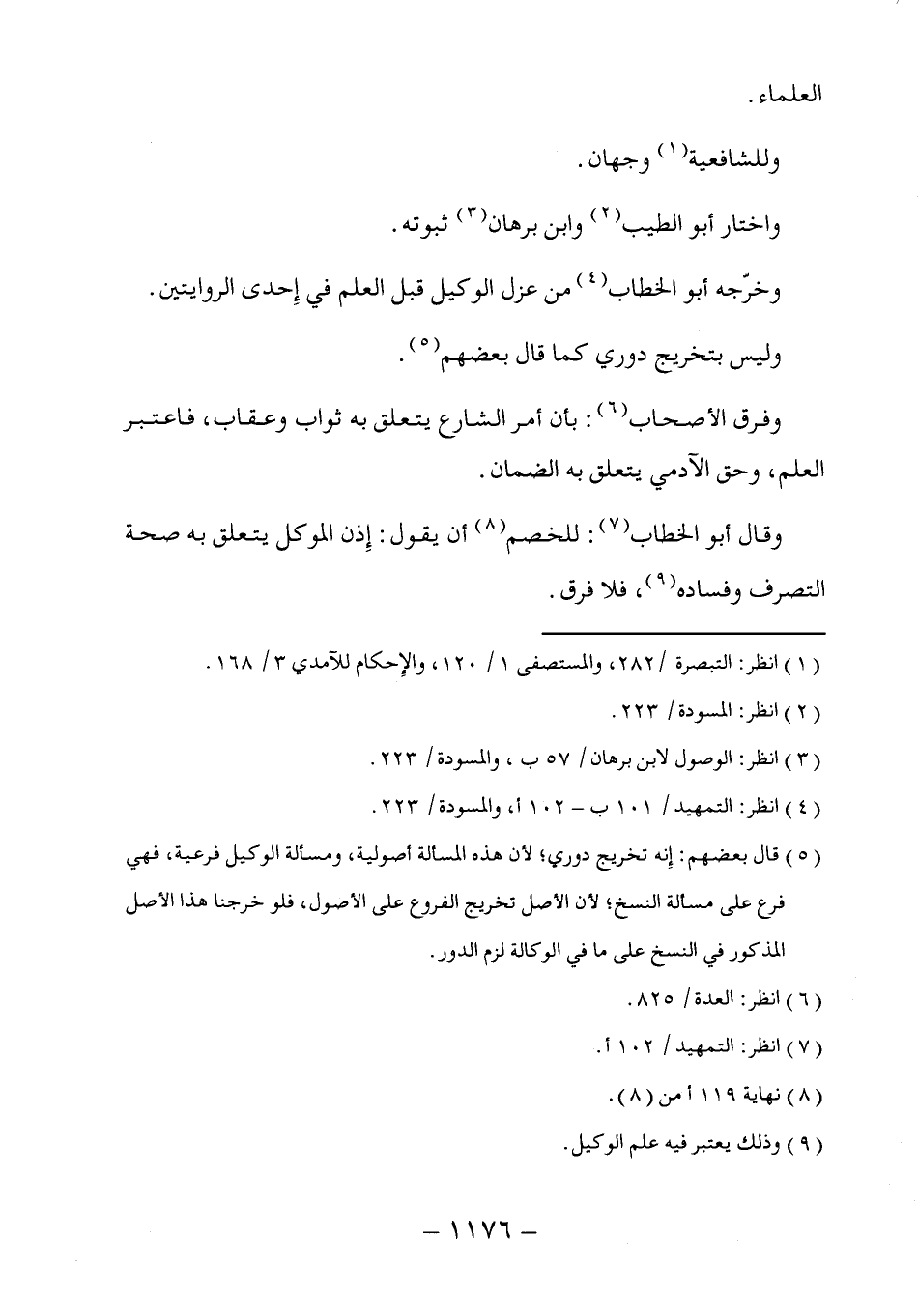 (٥) قالوا بعضهم: إِنه تخريج دوري؛ لأن هذه المسألة أصولية، ومسألة الوكيل فرعية، فهي فرع على مسألة النسخ؛ لأن الأصل تخريج الفروع على الأصول، فلو خرجنا هذا الأصل المذكور في النسخ على ما في الوكالة لزم الدور.