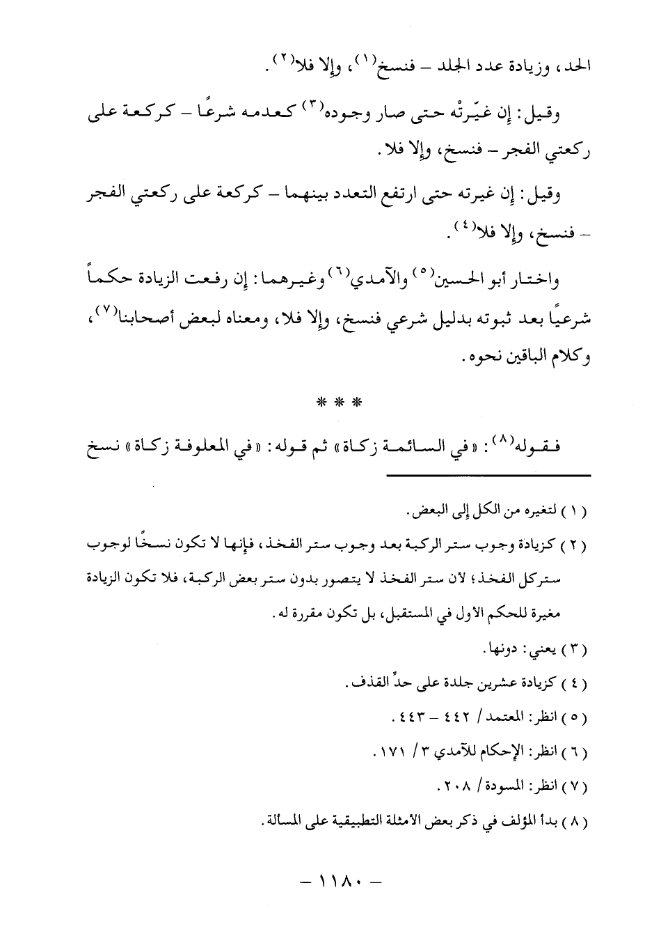 واختار أبو الحسين (٥) والآمدي (٦) وغيرهما: إِن رفعت الزيادة حكماً شرعيًا بعد ثبوته بدليل شرعي فنسخ، وإلا فلا، ومعناه لبعض أصحابنا (٧)، وكلام الباقين نحوه.