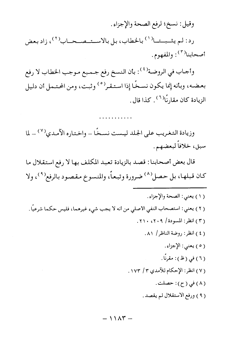 وأجاب في الروضة (٤): بأن النسخ رفع جميع موجب الخطاب لا رفع بعضه، وبأنه إِنما يكون نسخًا إِذا استقر (٥) وثبت، ومن المحتمل أن دليل الزيادة كان مقارنًا (٦). كذا قال.