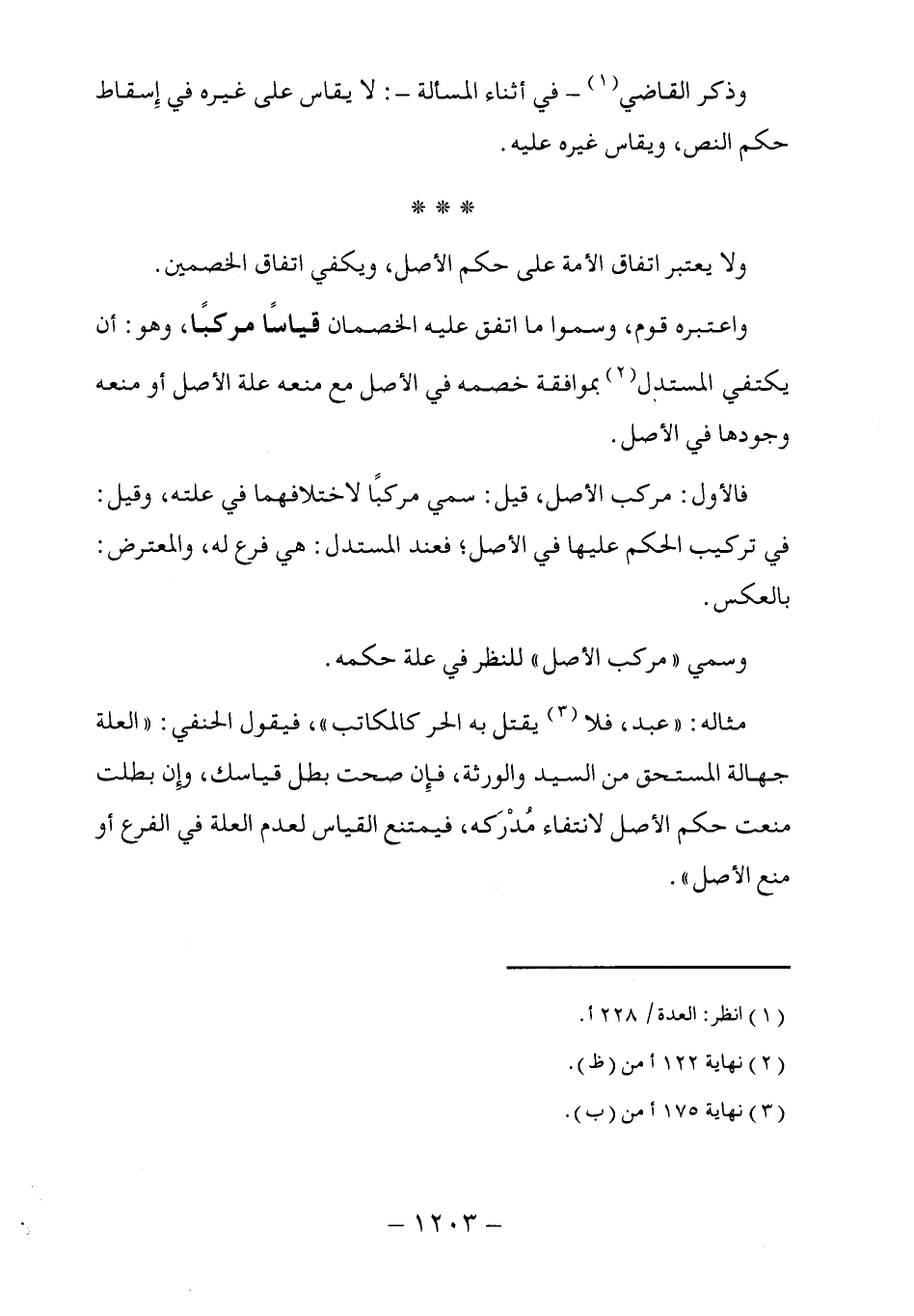 واعتبره قوم، وسموا ما اتفق عليه الخصمان قياسًا مركبًا، وهو: أن يكتفي المستدل (٢) بموافقة خصمه في الأصل مع منعه علة الأصل أو منعه وجودها في الأصل.