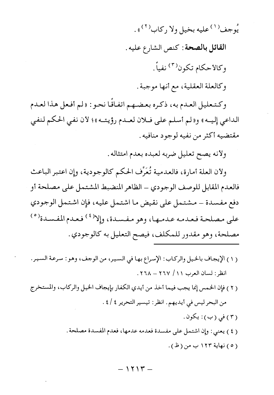 ولأن العلة أمارة، فالعدمية تُعَرِّف الحكم كالوجودية، وإن اعتبر الباعث فالعدم المقابل للوصف الوجودي -الظاهر المنضبط المشتمل على مصلحة أو دفع مفسدة- مشتمل على نقيض اشتمل عليه، فإِن اشتمل الوجودي على مصلحة فعدمه عدمها، وهو مفسدة، وإلا (٤) فعدم المفسدة (٥) مصلحة، وهو مقدور للمكلف، فيصح التعليل به كالوجودي.
