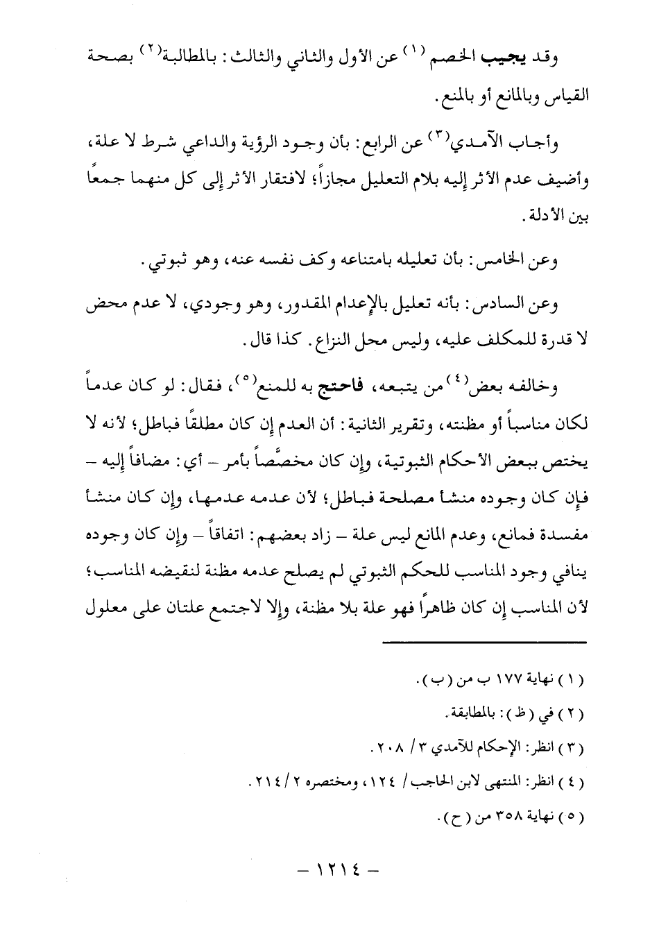 وخالفه بعض (٤) من يتبعه، فاحتج به للمنع (٥)، فقال: لو كان عدماً لكان مناسباً أو مظنته، وتقرير الثانية: أن العدم إِن كان مطلقًا فباطل؛ لأنه لا يختص ببعض الأحكام الثبوتية، وإن كان مخصَّصاً بأمر -أي: مضافاً إِليه- فإِن كان وجوده منشأ مصلحة فباطل؛ لأن عدمه عدمها، وإن كان منشأ مفسدة فمانع، وعدم المانع ليس علة -زاد بعضهم: اتفاقاً- وإن كان وجوده ينافي وجود المناسب للحكم الثبوتي لم يصلح عدمه مظنة لنقيضه المناسب؛ لأن المناسب إِن كان ظاهرًا فهو علة بلا مظنة، وإلا لاجتمع علتان على معلول