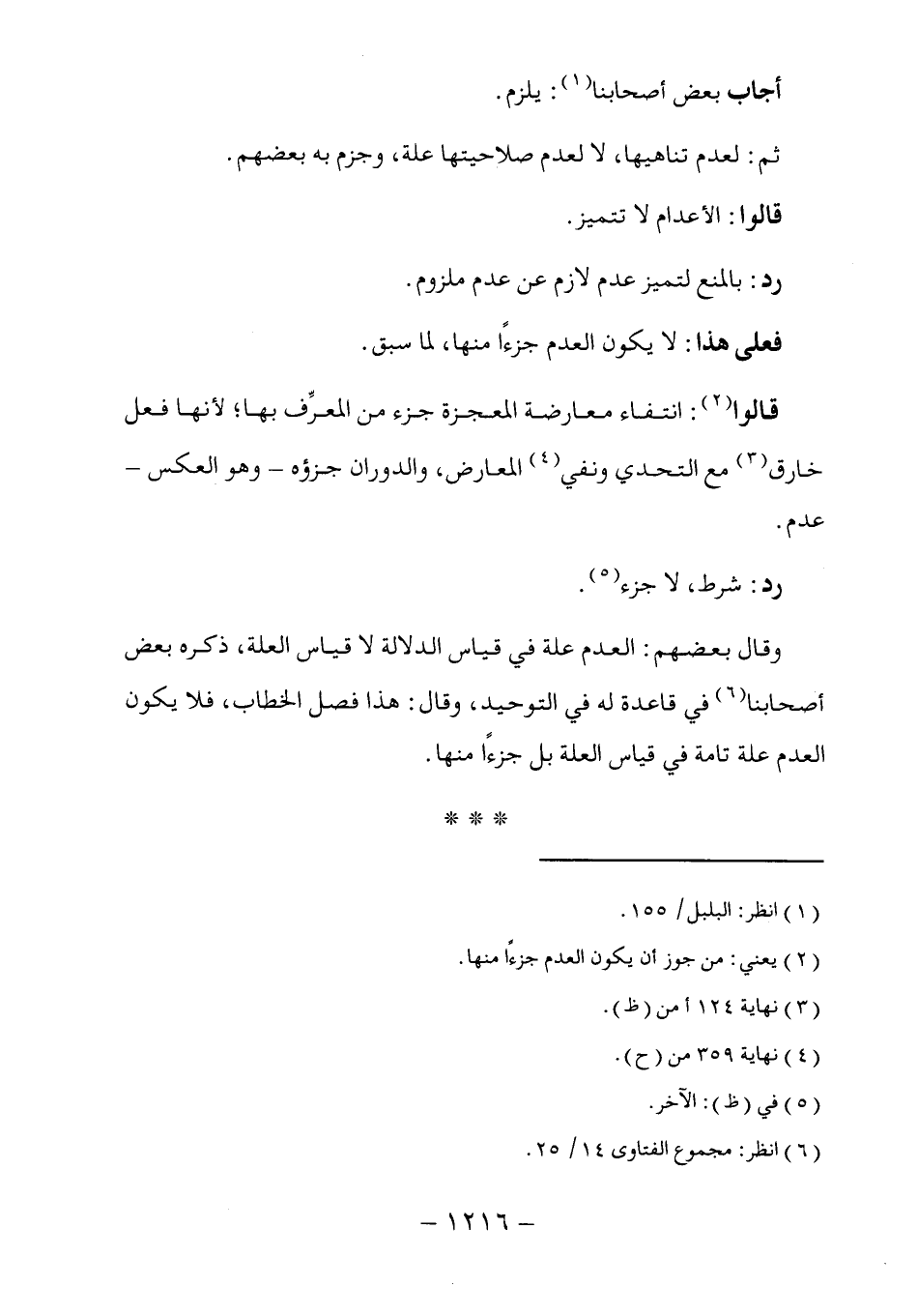 وقال بعضهم: العدم علة في قياس الدلالة لا قياس العلة، ذكره بعض أصحابنا (٦) في قاعدة له في التوحيد، وقال: هذا فصل الخطاب، فلا يكون العدم علة تامة في قياس العلة بل جزءًا منها.