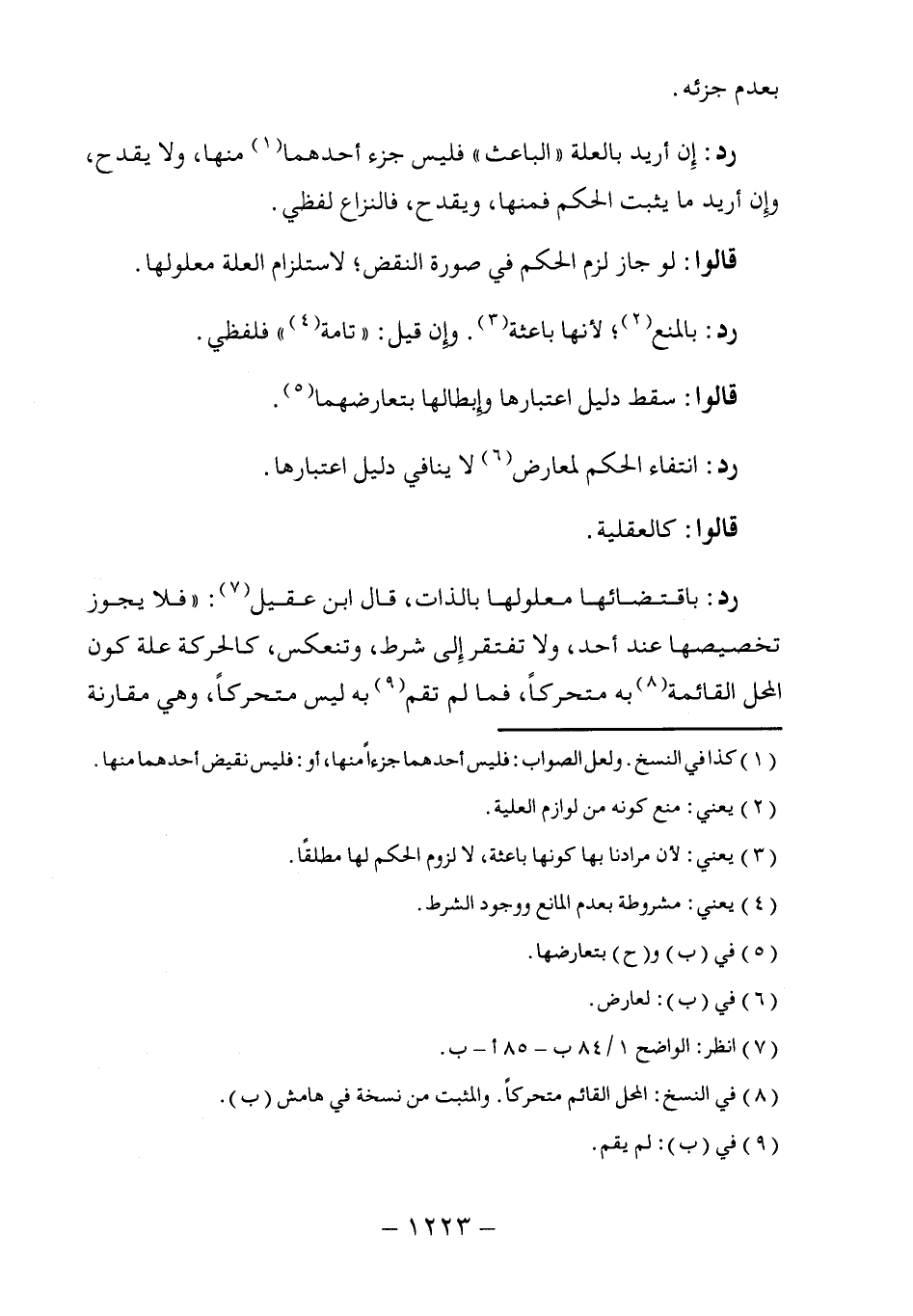رد: باقتضائها معلولها بالذات، قال ابن عقيل (٧): "فلا يجوز تخصيصها عند أحد، ولا تفتقر إِلى شرط، وتنعكس، كالحركة علة كون المحل القائمة (٨) به متحركاً، فما لم تقم (٩) به ليس متحركاً، وهي مقارنة