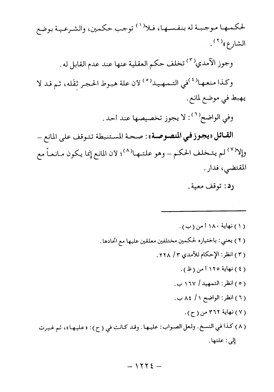 القائل "يجوز في المنصوصة": صحة المستنبطة تتوقف على المانع -وإلا (٧) لم يتخلف الحكم -وهو علتها (٨)؛ لأن المانع إِنما يكون مانعاً مع المقتضي، فدار.