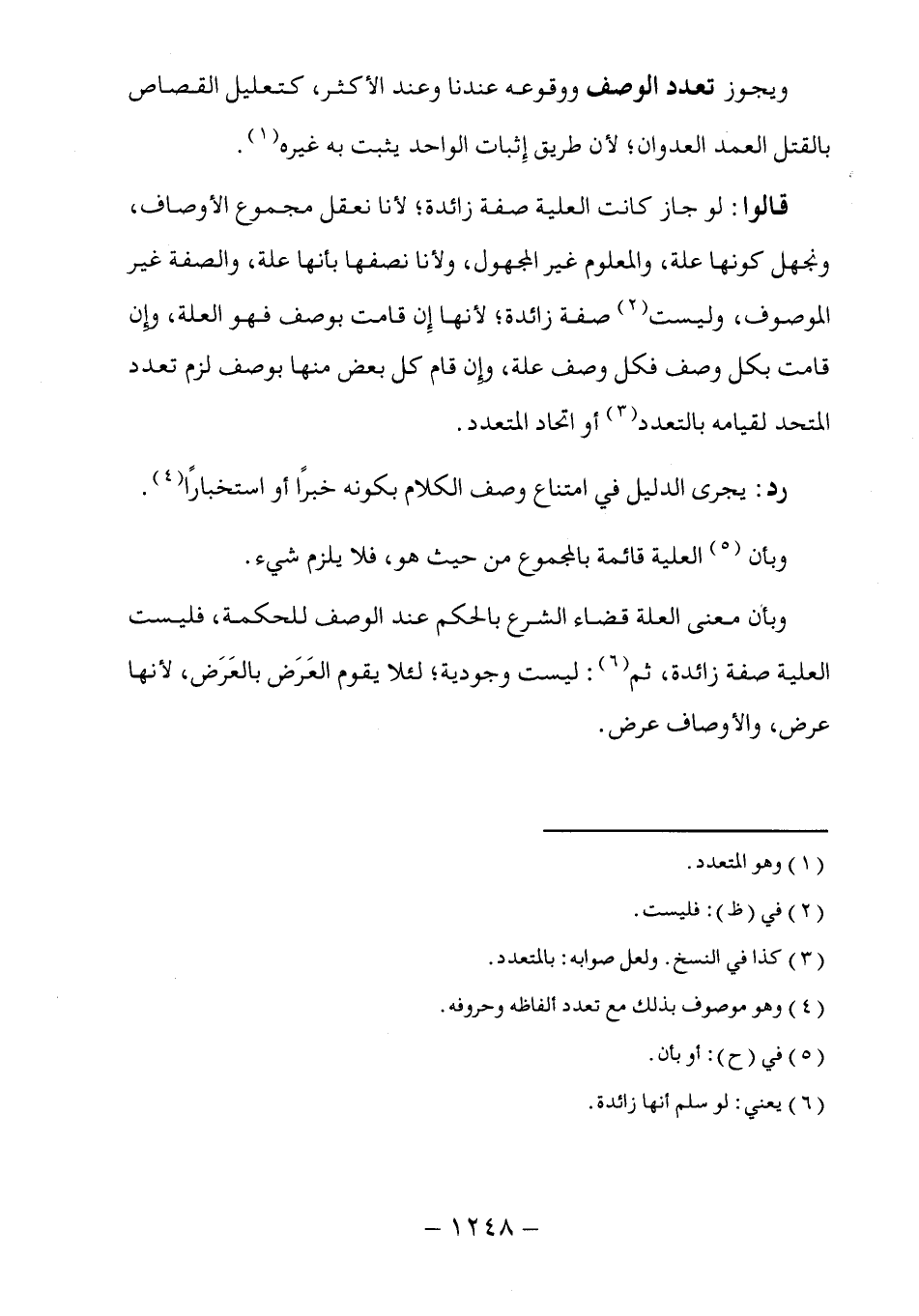 ويجوز تعدد الوصف ووقوعه عندنا وعند الأكثر، كتعليل القصاص بالقتل العمد العدوان؛ لأن طريق إِثبات الواحد يثبت به غيره (١).