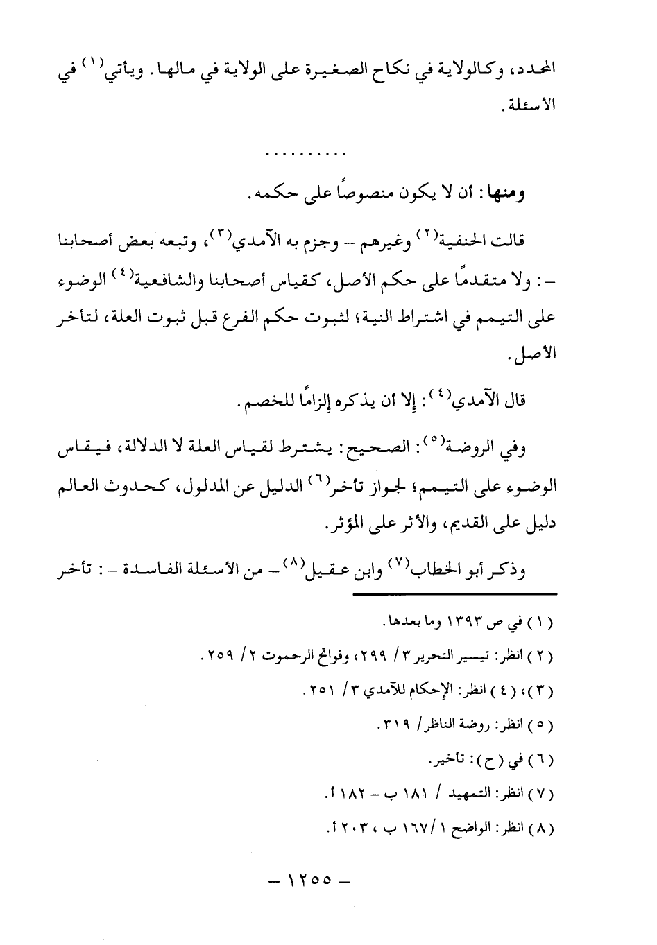 قالت الحنفية (٢) وغيرهم -وجزم به الآمدي (٣)، وتبعه بعض أصحابنا -: ولا متقدمًا على حكم الأصل، كقياس أصحابنا والشافعية (٤) الوضوء على التيمم في اشتراط النية؛ لثبوت حكم الفرع قبل ثبوت العلة؛ لتأخر الأصل.