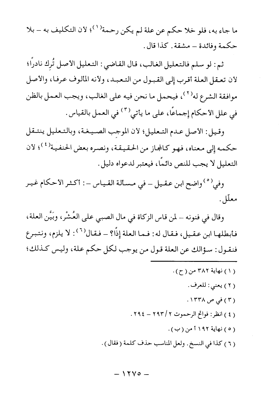 وقال في فنونه -لمن قاس الزكاة في مال الصبي على العُشْر، وبَيَّن العلة، فأبطلها ابن عقيل، فقال له: فما العلة إِذًا؟ - فقال (٦): لا يلزم، ونتبرع فنقول: سؤالك عن العلة قول من يوجب لكل حكم علة، وليس كذلك؛