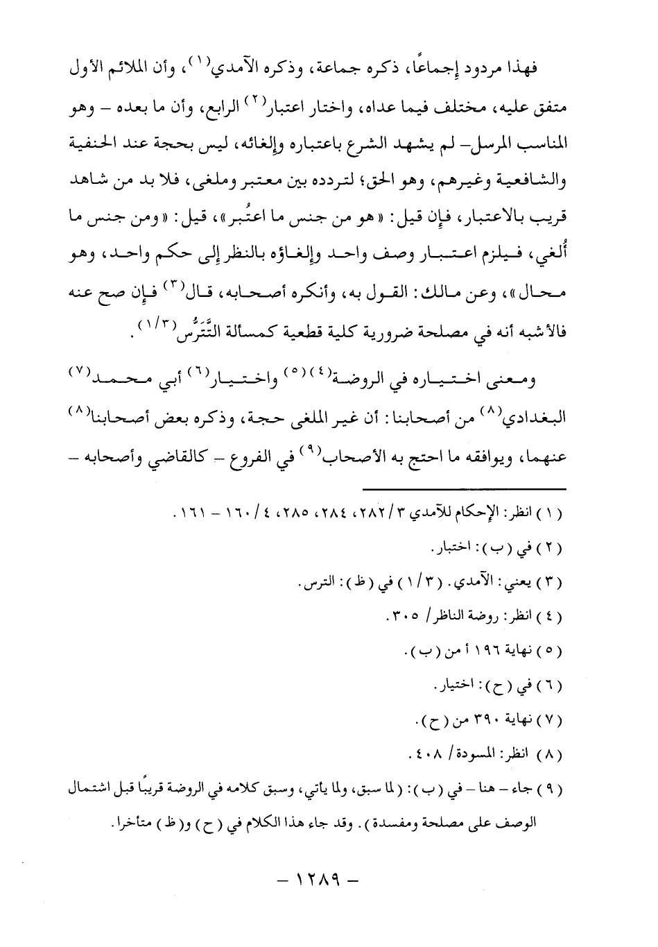 ومعنى اختياره في الروضة (٤) (٥) واختيار (٦) أبي محمَّد (٧) البغدادي (٨) من أصحابنا: أن غير الملغى حجة، وذكره بعض أصحابنا (٨) عنهما، ويوافقه ما احتج به الأصحاب (٩) في الفروع -كالقاضي وأصحابه-