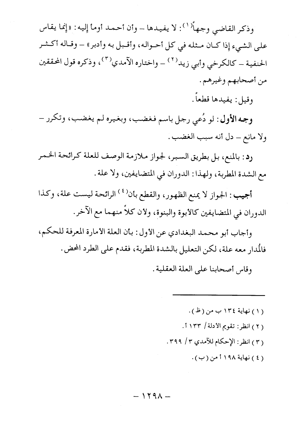 وذكر القاضي وجهاً (١): لا يفيدها -وأن أحمد أومأ إِليه: "إِنما يقاس على الشيء إِذا كان مثله في كل أحواله، وأقبل به وأدبر"- وقاله أكثر الحنفية -كالكرخي وأبي زيد (٢) - واختاره الآمدي (٣)، وذكره قول المحققين من أصحابهم وغيرهم.