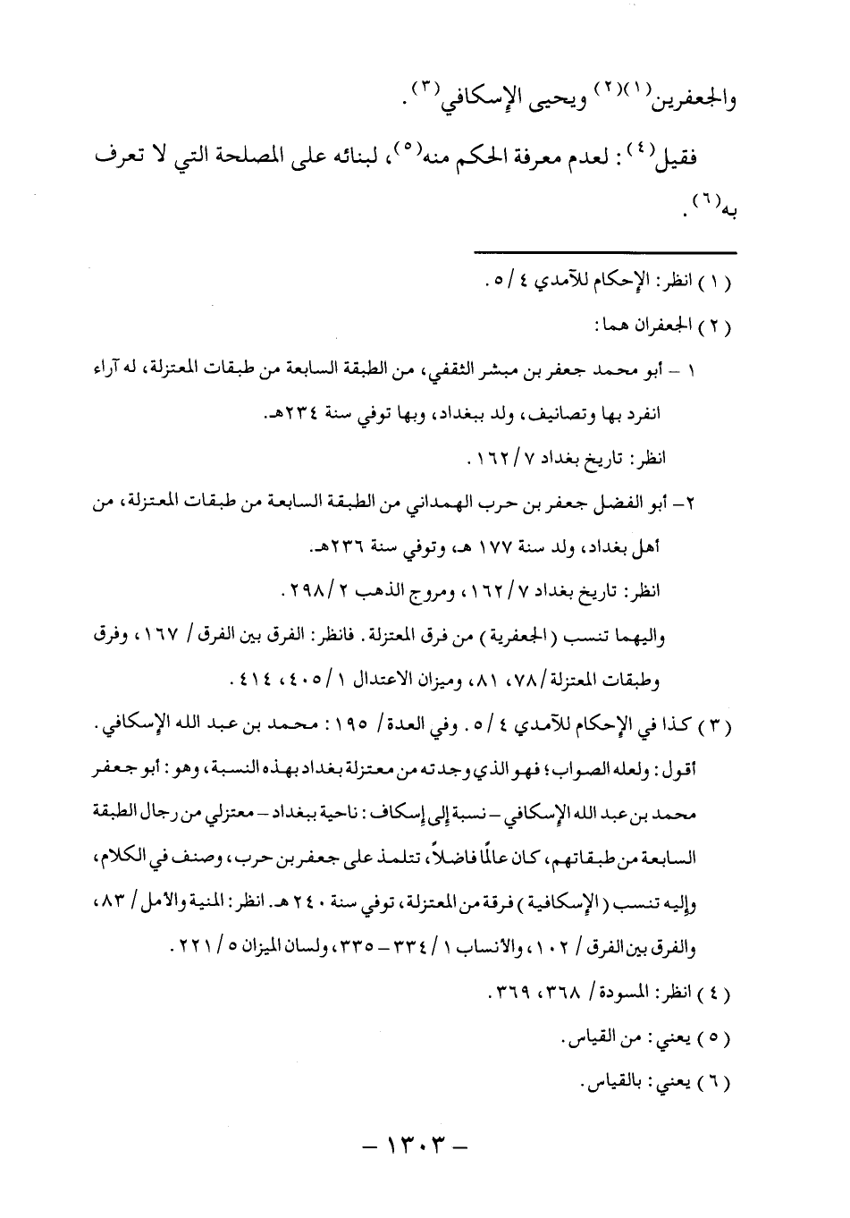 (٣) كذا في الإِحكام للآمدى ٤/ ٥. وفي العدة/ ١٩٥: محمَّد بن عبد الله الإِسكافي. أقول: ولعله الصواب؛ فهو الذي وجدته من معتزلة بغداد بهذه النسبة، وهو: أبو جعفر محمَّد بن عبد الله الإِسكافي -نسبة إِلى إسكاف: ناحية ببغداد- معتزلي من رجال الطبقة السابعة من طبقاتهم، كان عالمًا فاضلاً، تتلمذ على جعفر بن حرب، وصنف في الكلام، وإليه تنسب (الإِسكافية) فرقة من المعتزلة، توفي سنة ٢٤٠ هـ. انظر: المنية والأمل/ ٨٣، والفرق بين الفرق/ ١٠٢، والأنساب ١/ ٣٣٤ - ٣٣٥، ولسان الميزان ٥/ ٢٢١.