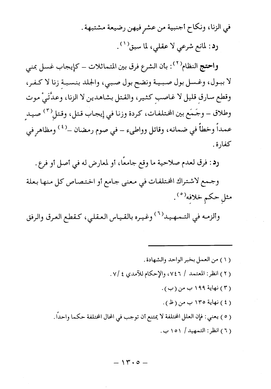 واحتج النظام (٢): بأن الشرع فرق بين المتماثلات -كإِيجاب غسل بمني لا ببول، وغسل بول صبية ونضح بول صبي، والجلد بنسبةِ زنا لا كفر، وقطع سارقِ قليل لا غاصبِ كثير، والقتل بشاهدين لا الزنا، وعدَّتَيْ موت وطلاق- وجَمَع بين المختلفات، كردة وزنا في إِيجاب قتل، وقتلِ (٣) صيدٍ عمدًا وخطاً في ضمانه، وقاتل وواطىء -في صوم رمضان- (٤) ومظاهرٍ في كفارة.